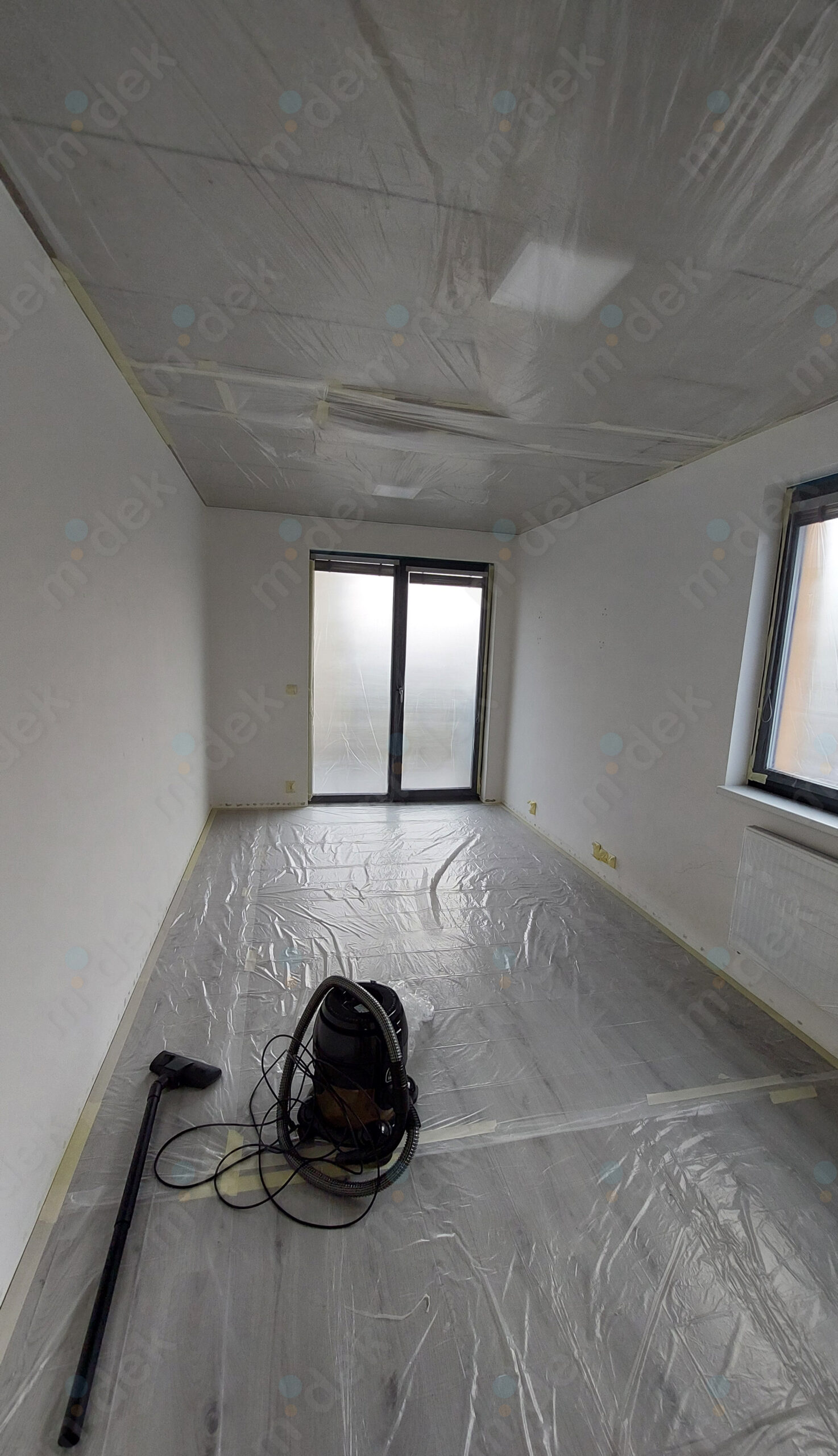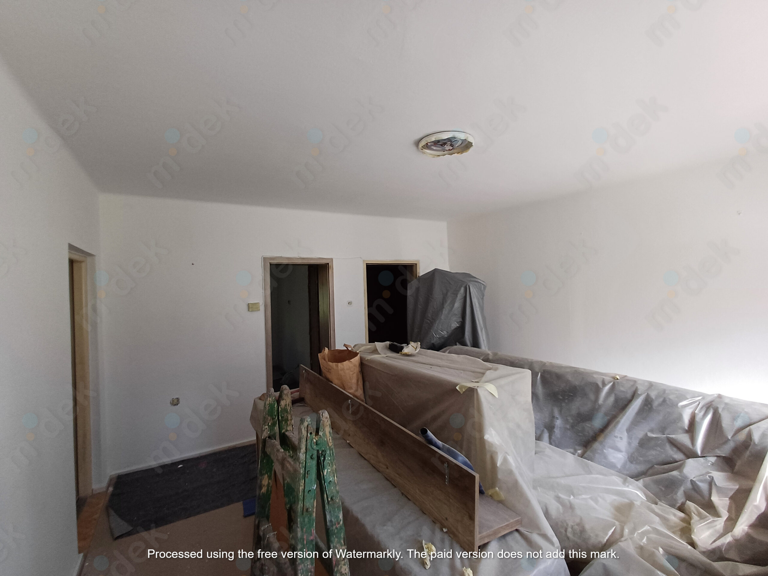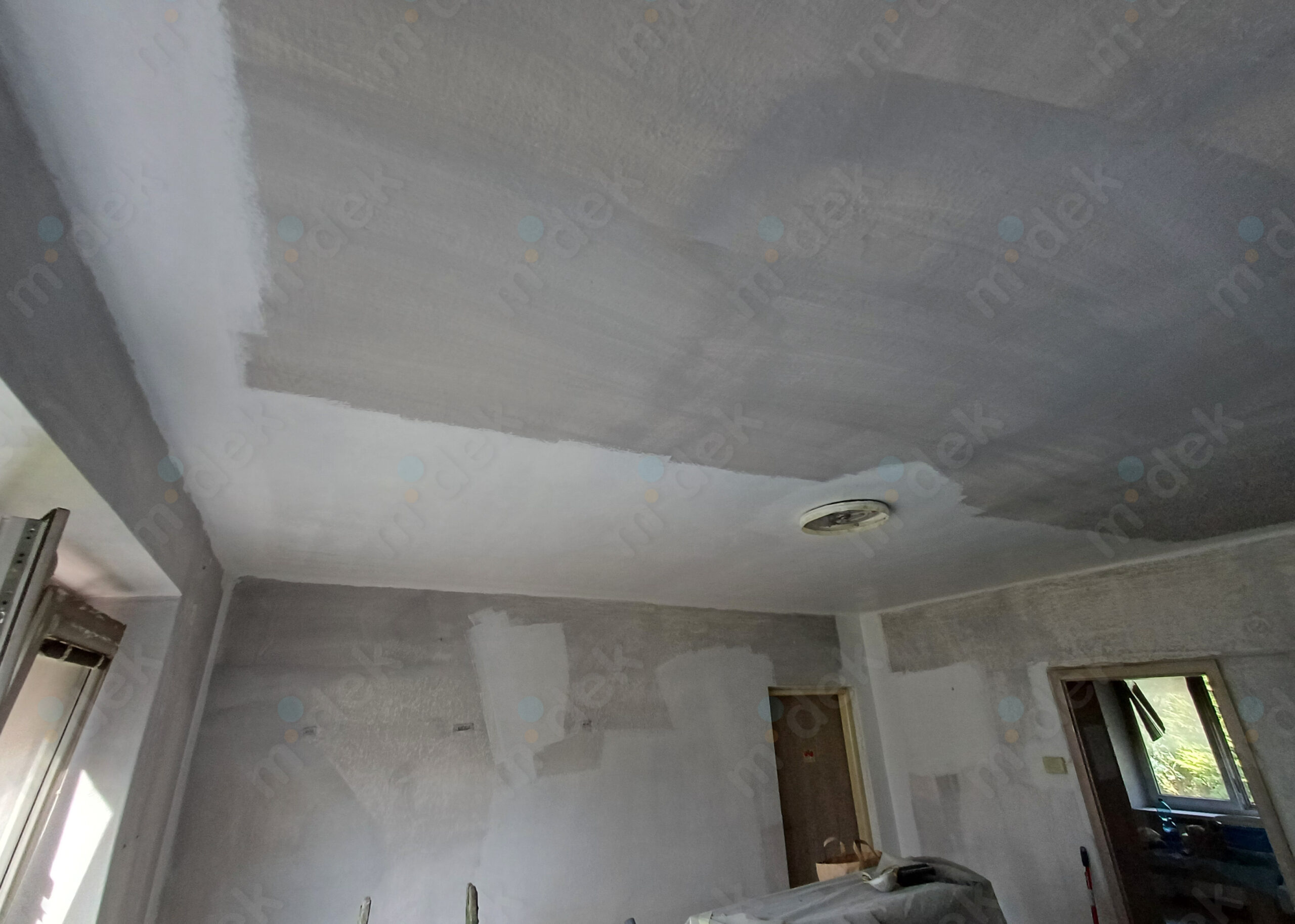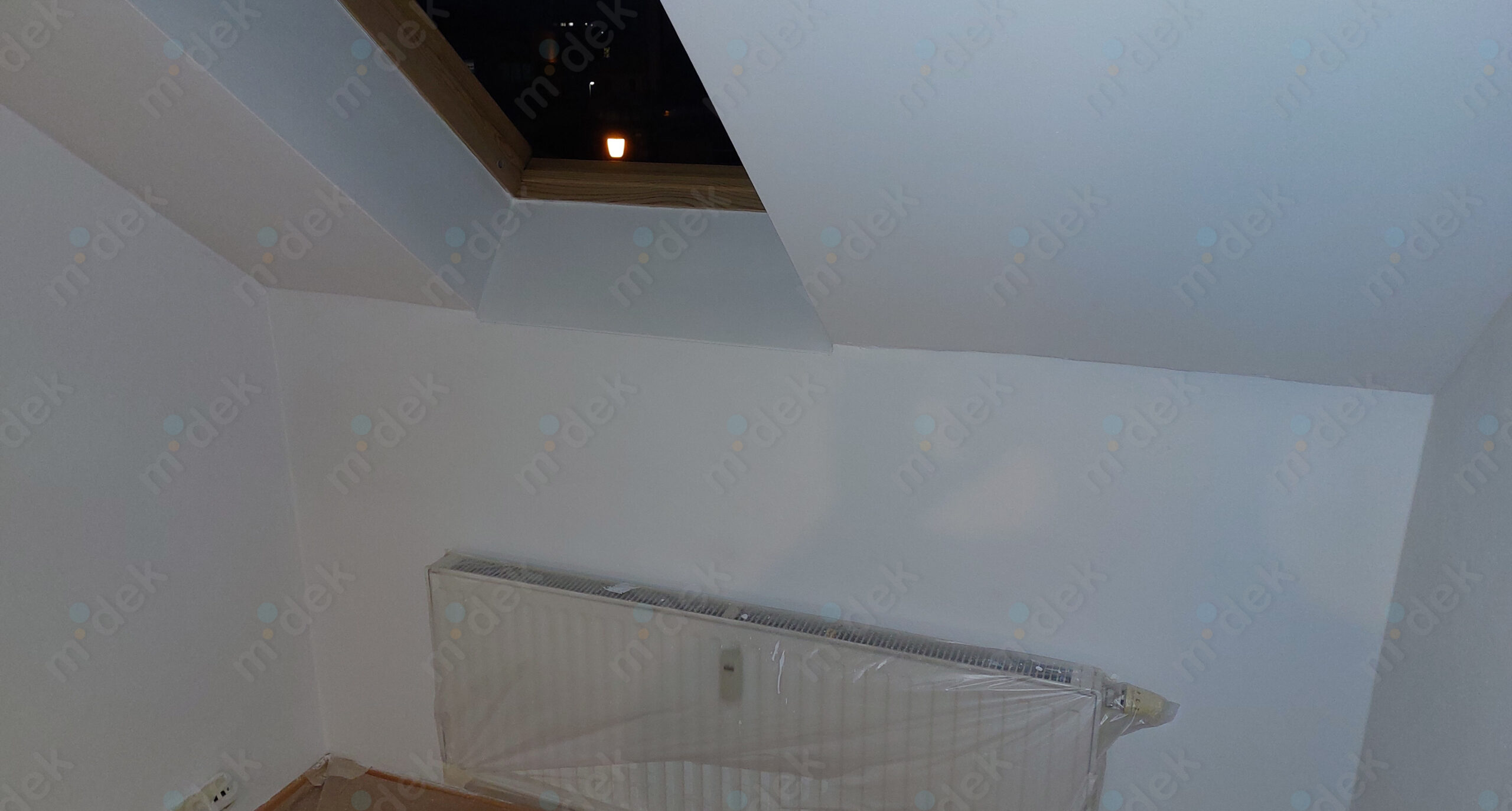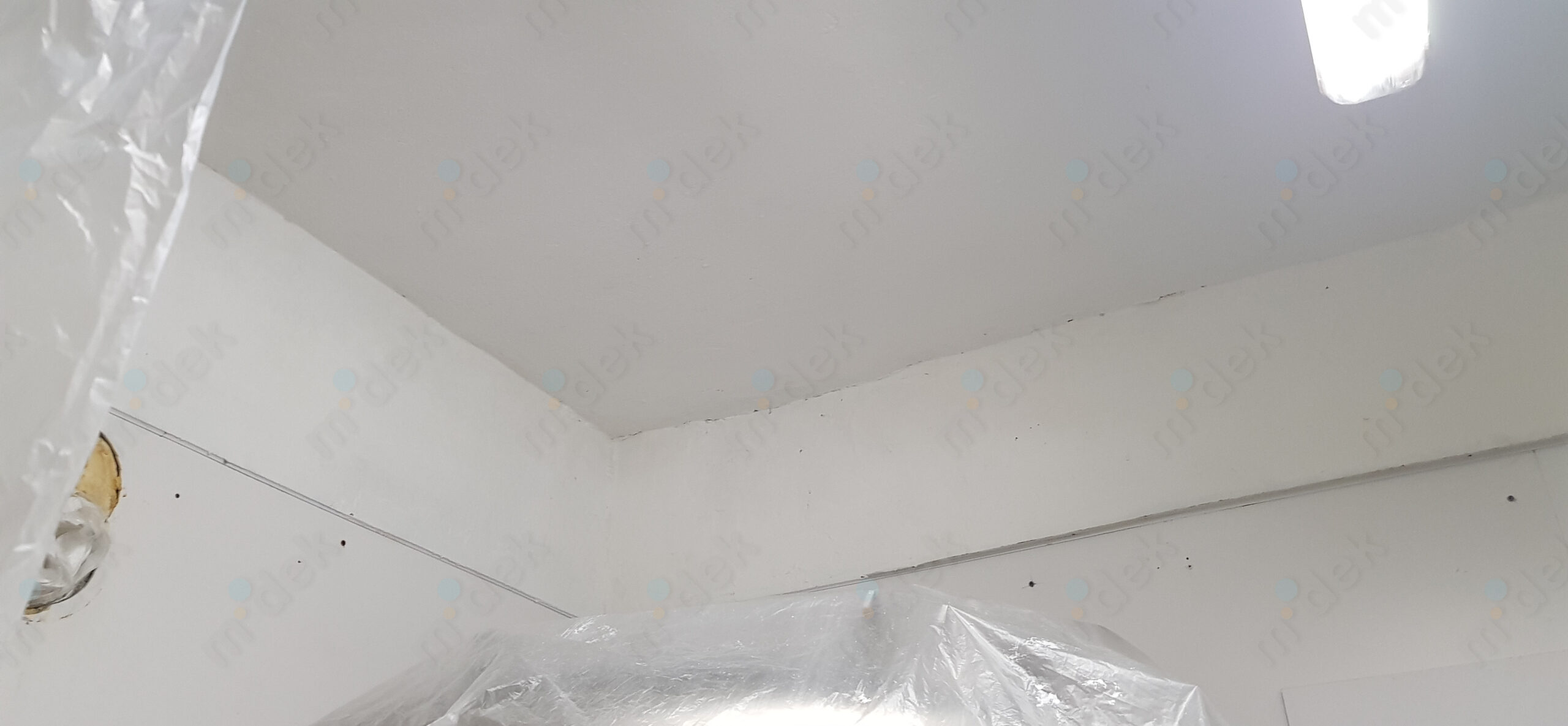 Zakrytí podlah, mechanické odstranění napadených omítek, fungicidní penetrace, lokální opravy omítek, 3 vrstvy protiplísňové barvy, úklid. Ve chvíli, kdy se strop odkryl a nyní se celý prostor větrá, tak je výmalba dlouhodobě v pořádku a čistá bez plísní.