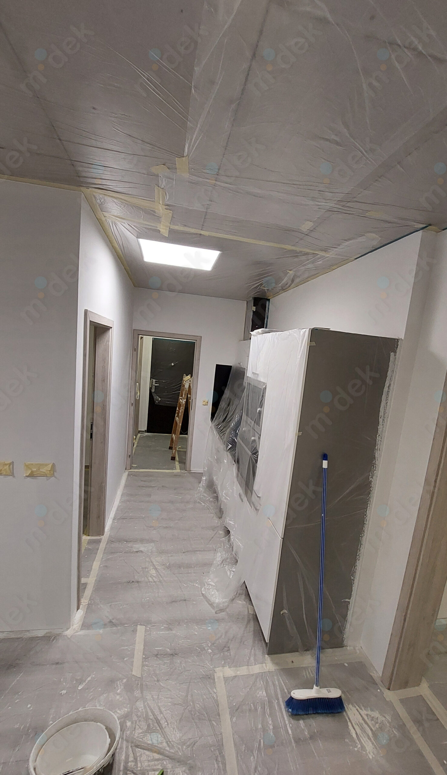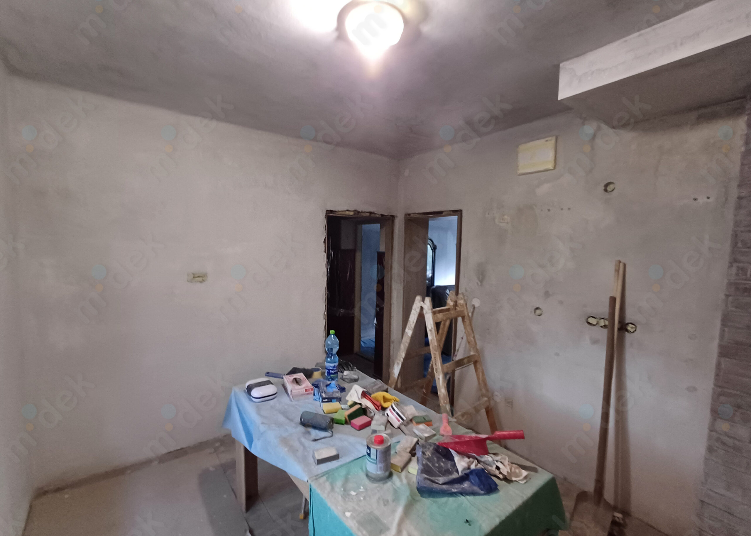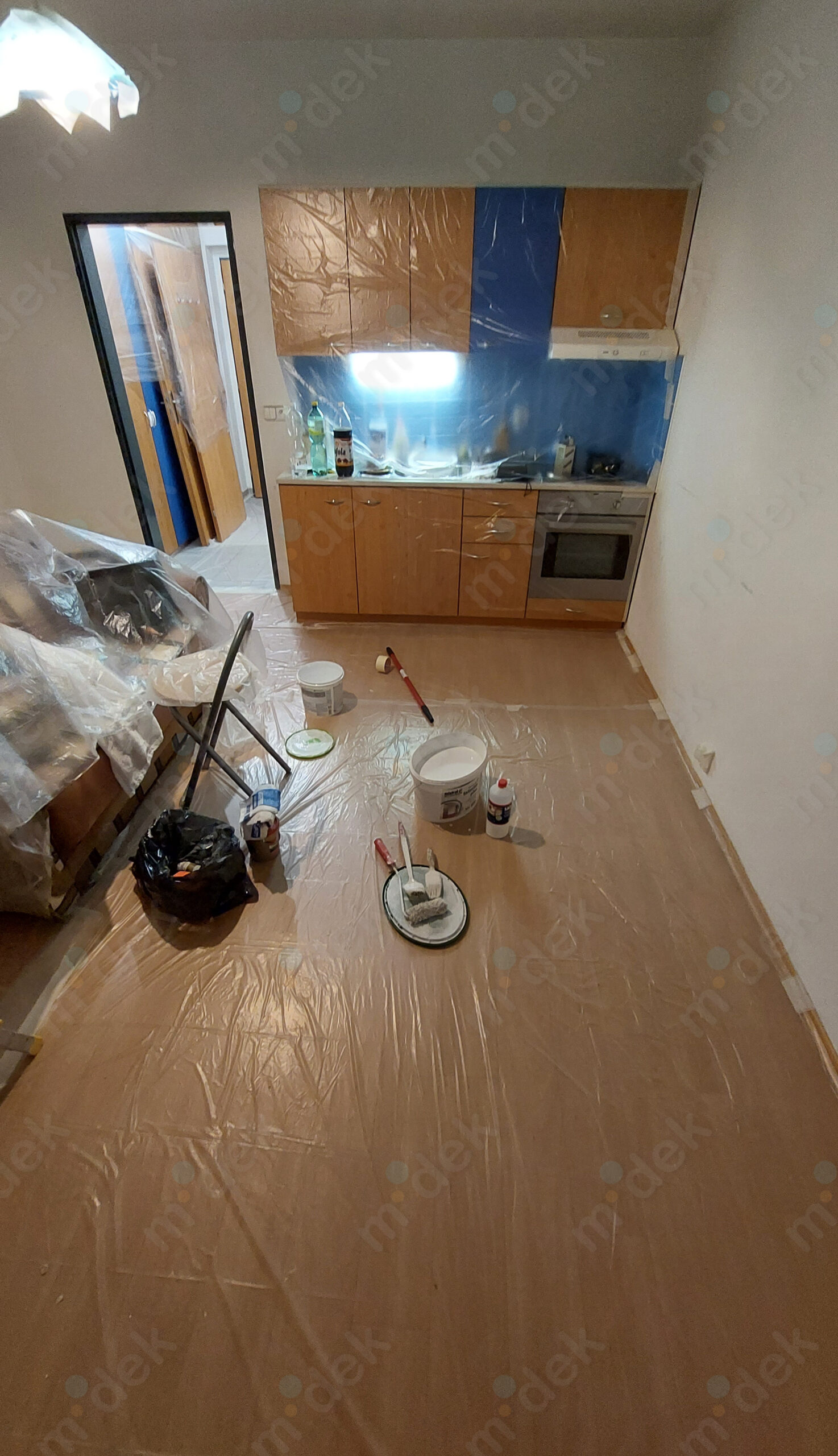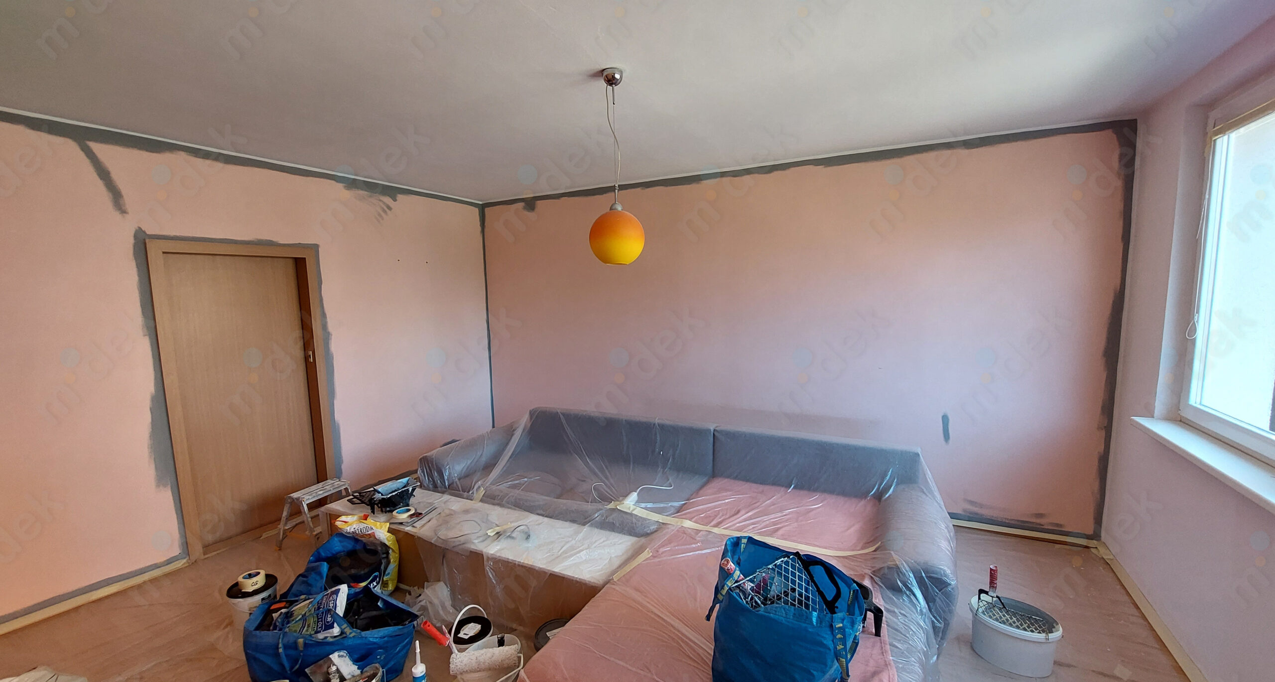 Zakrytí podlah, vyplnění rýh elektrorozvodů, nová omítka, penetrace, další lokální opravy omítek, částečné sundání linkrusty (sokl), 2 vrstvy akrylátové barvy, úklid.