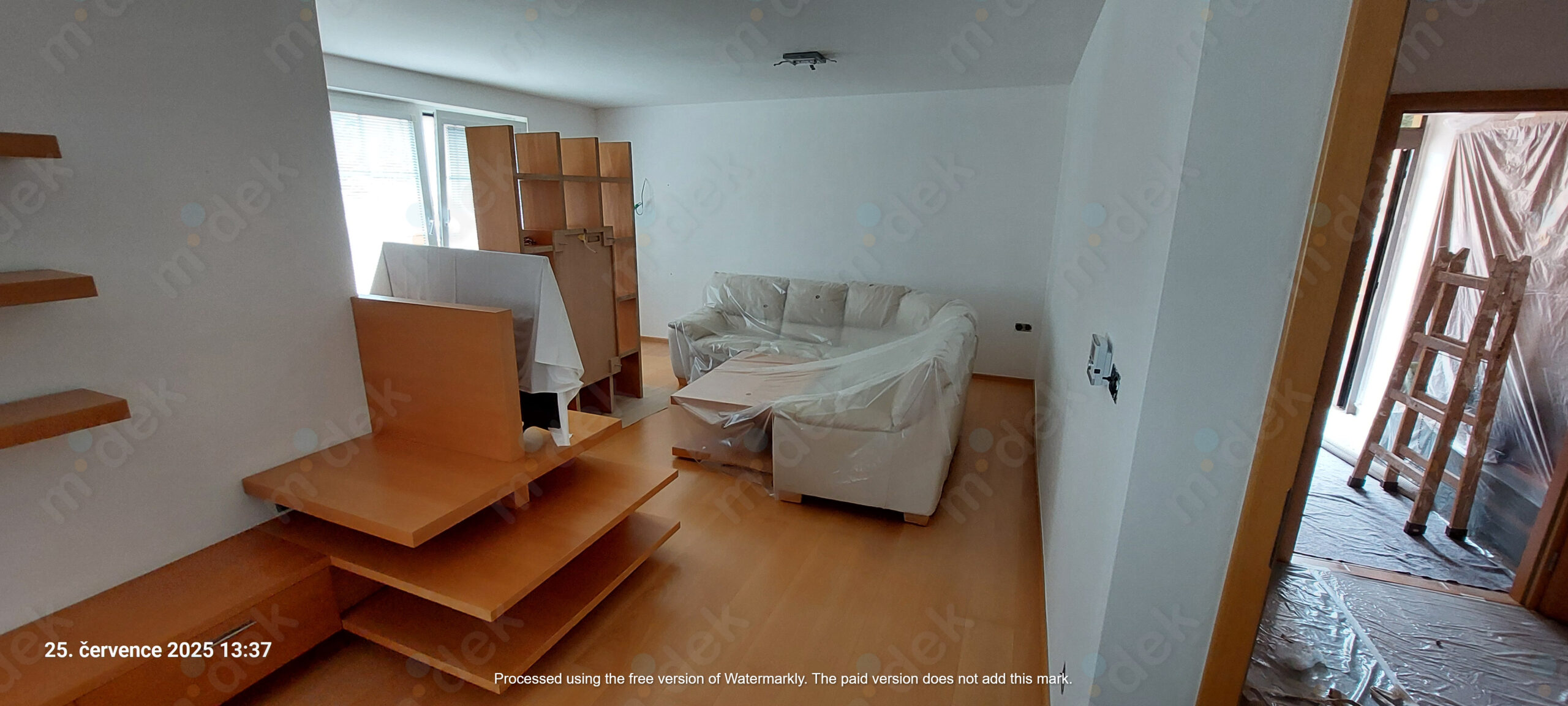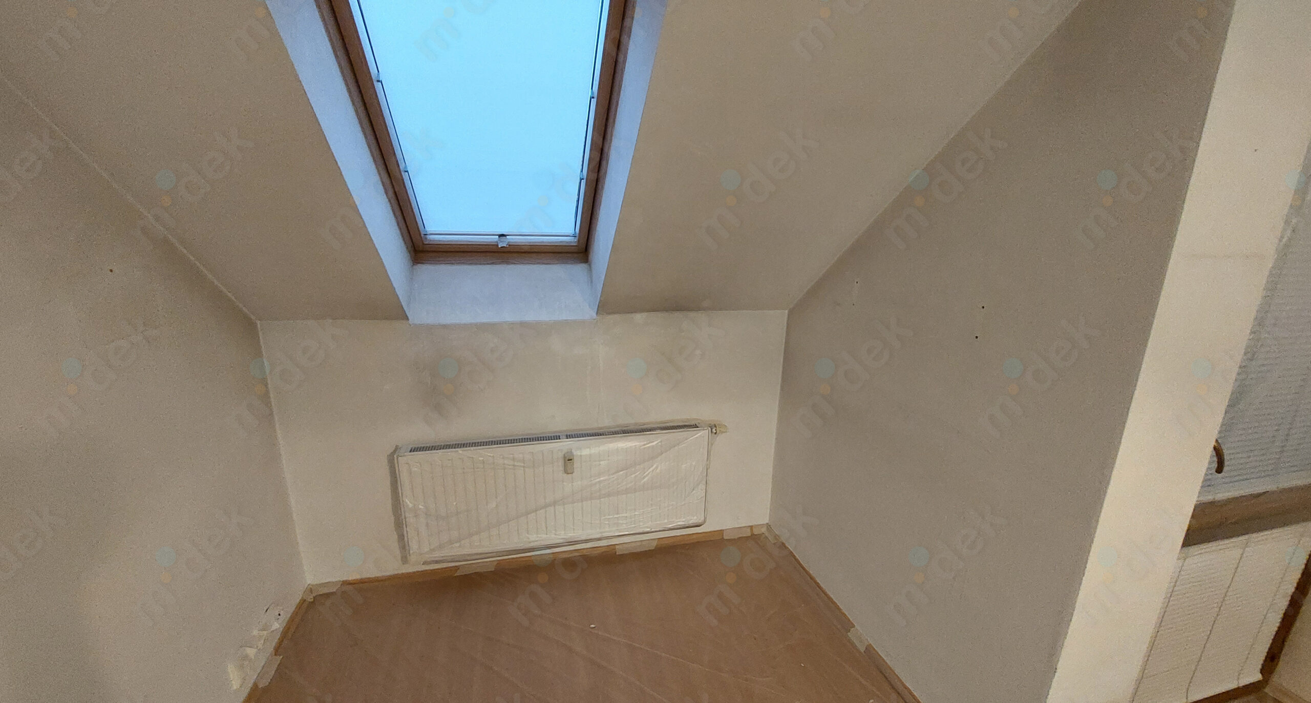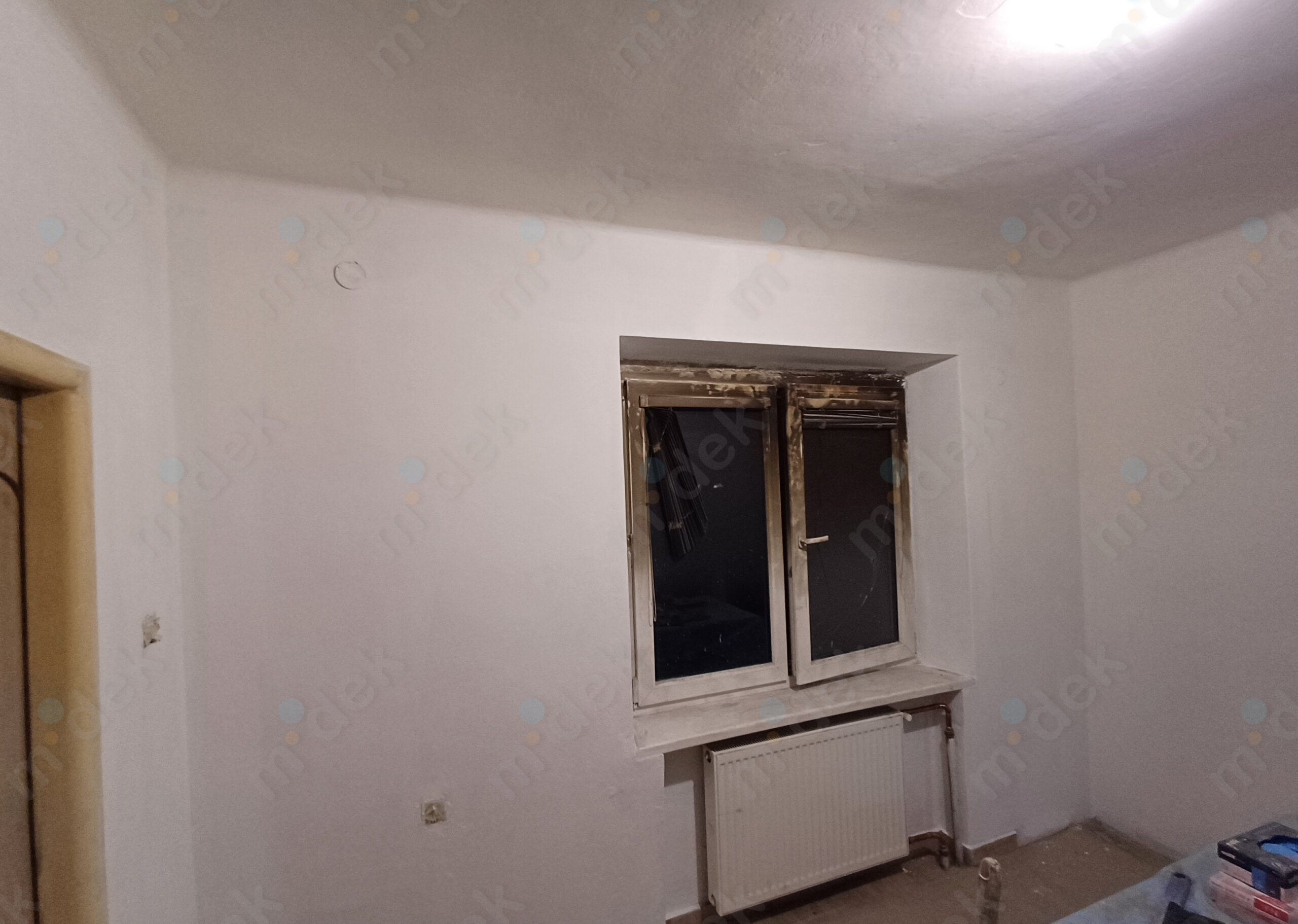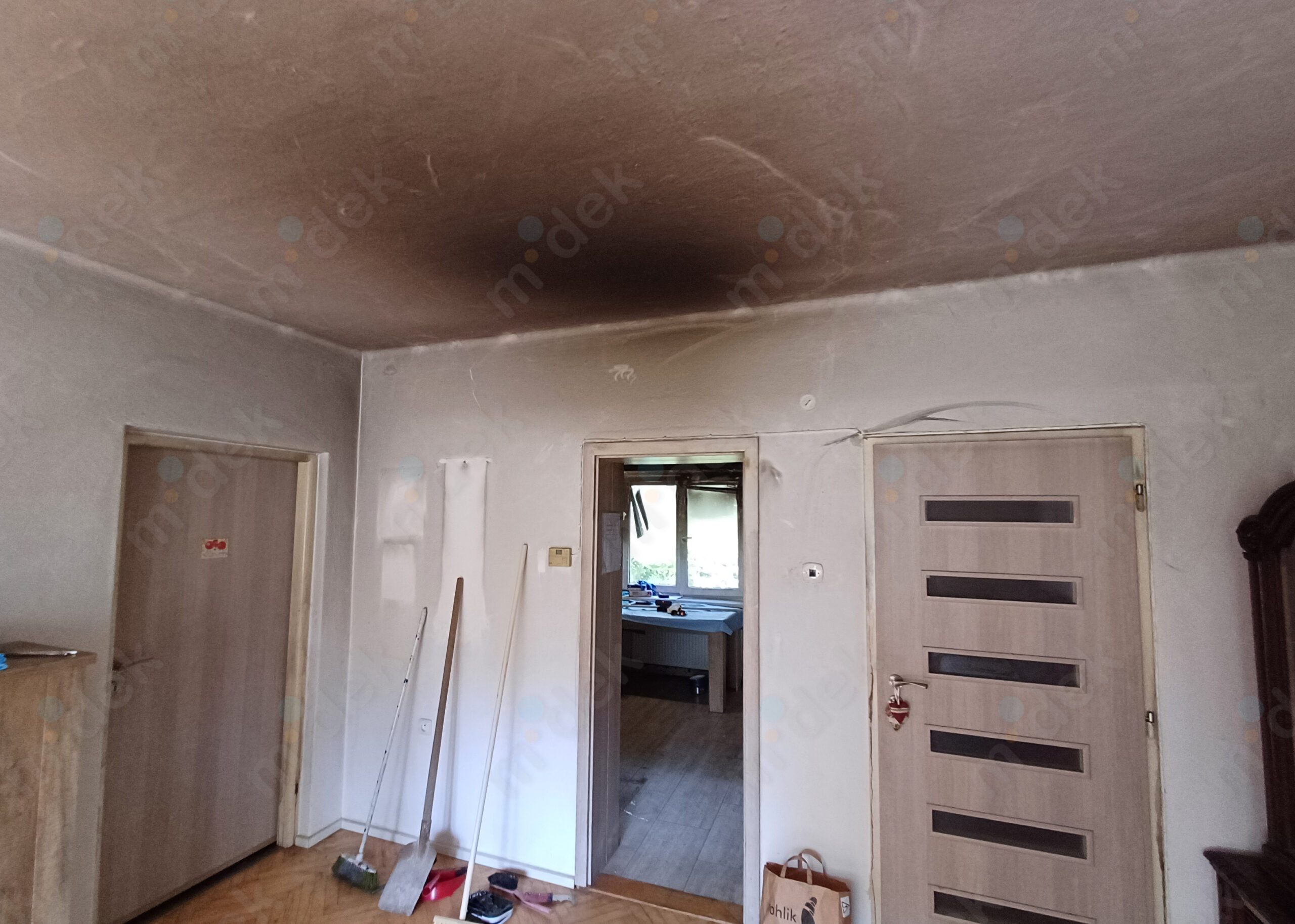 Zakrytí podlah, vyplnění rýh elektrorozvodů, nová omítka, penetrace, další lokální opravy omítek, částečné sundání linkrusty (sokl), 2 vrstvy akrylátové barvy, úklid.
