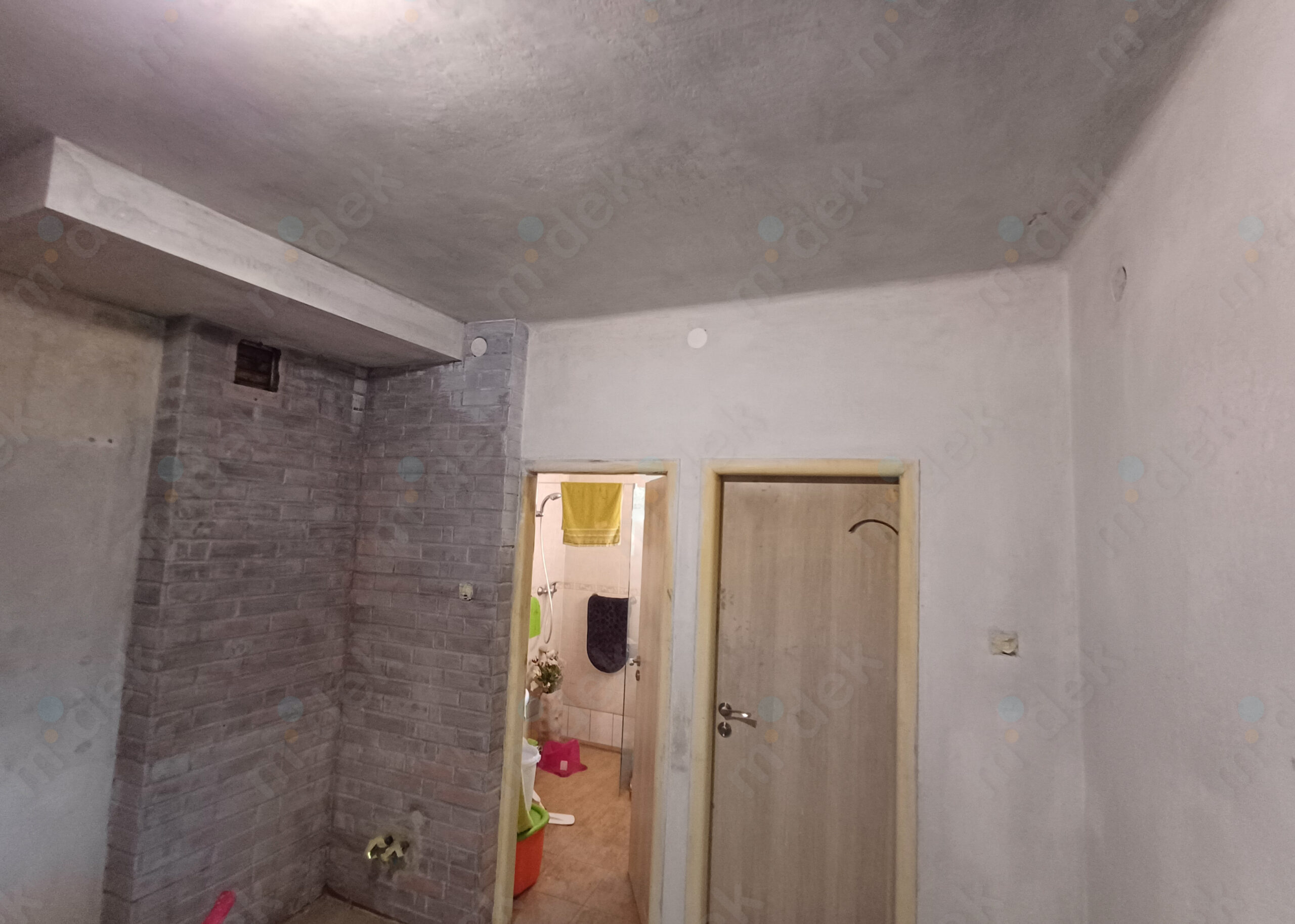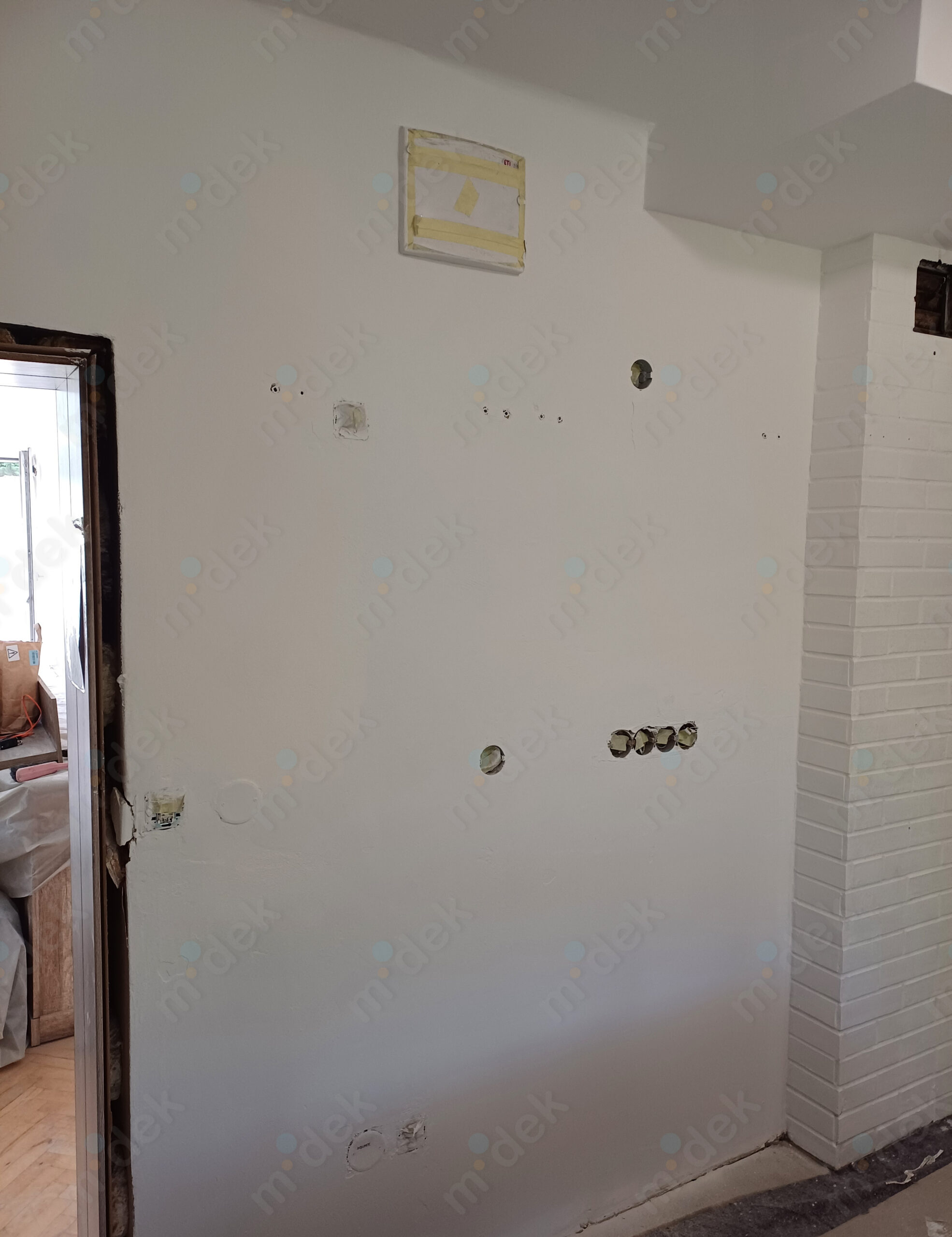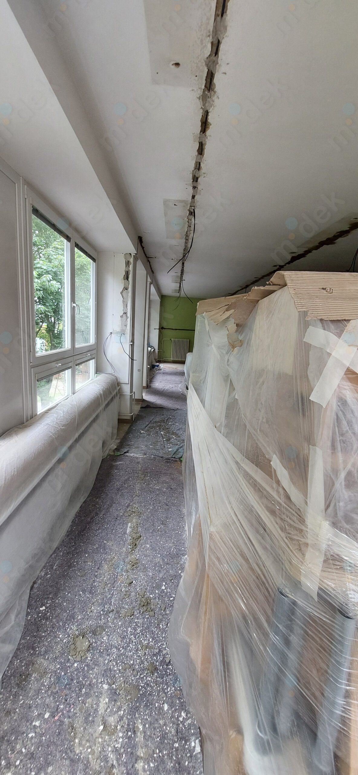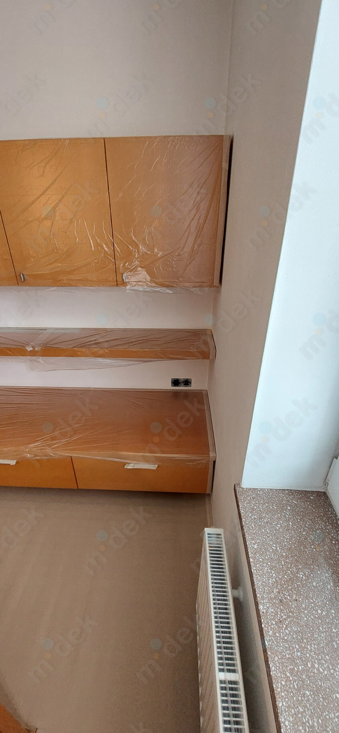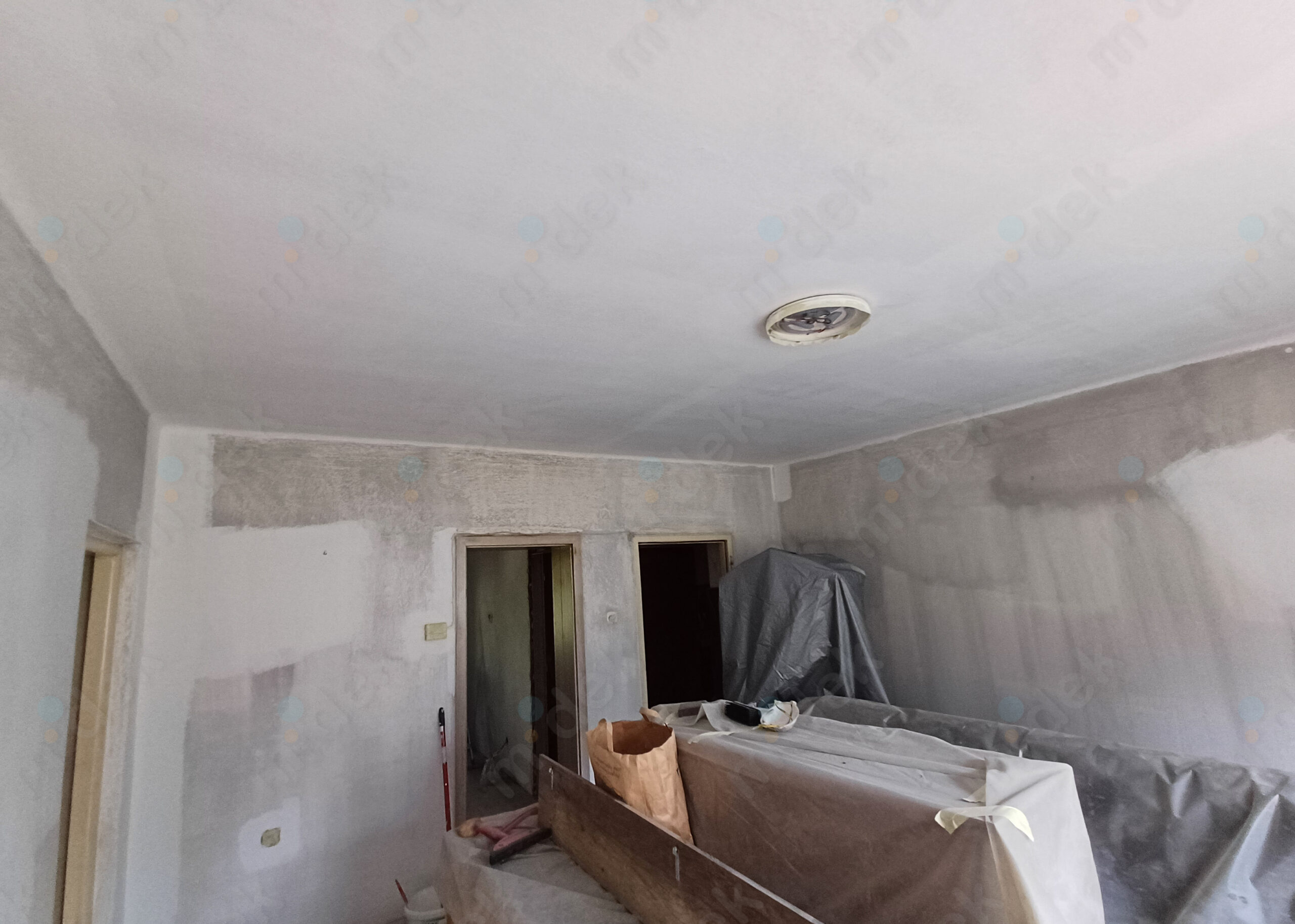 Zakrytí podlah, vyplnění rýh elektrorozvodů, nová omítka, penetrace, další lokální opravy omítek, částečné sundání linkrusty (sokl), 2 vrstvy akrylátové barvy, úklid.