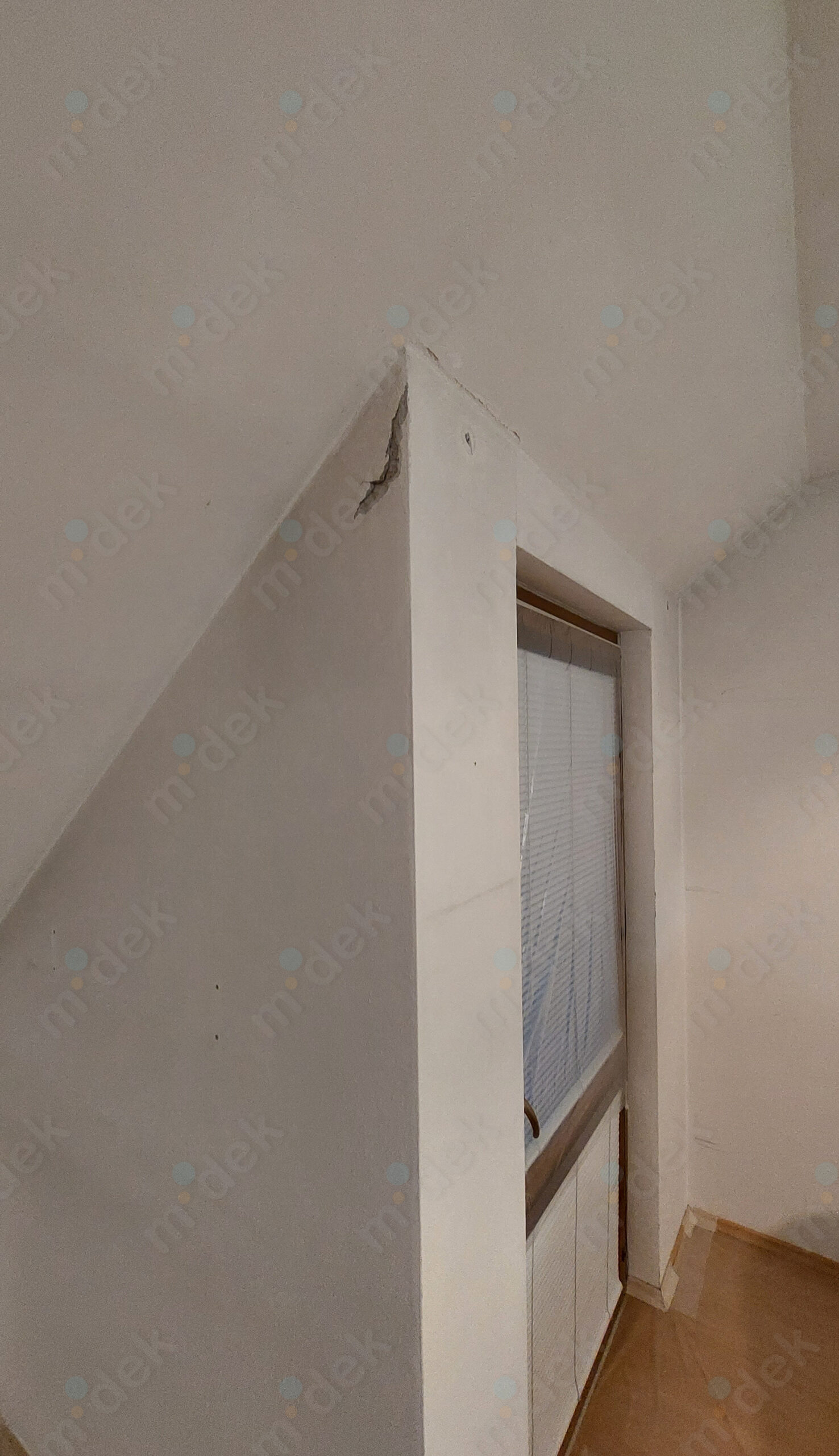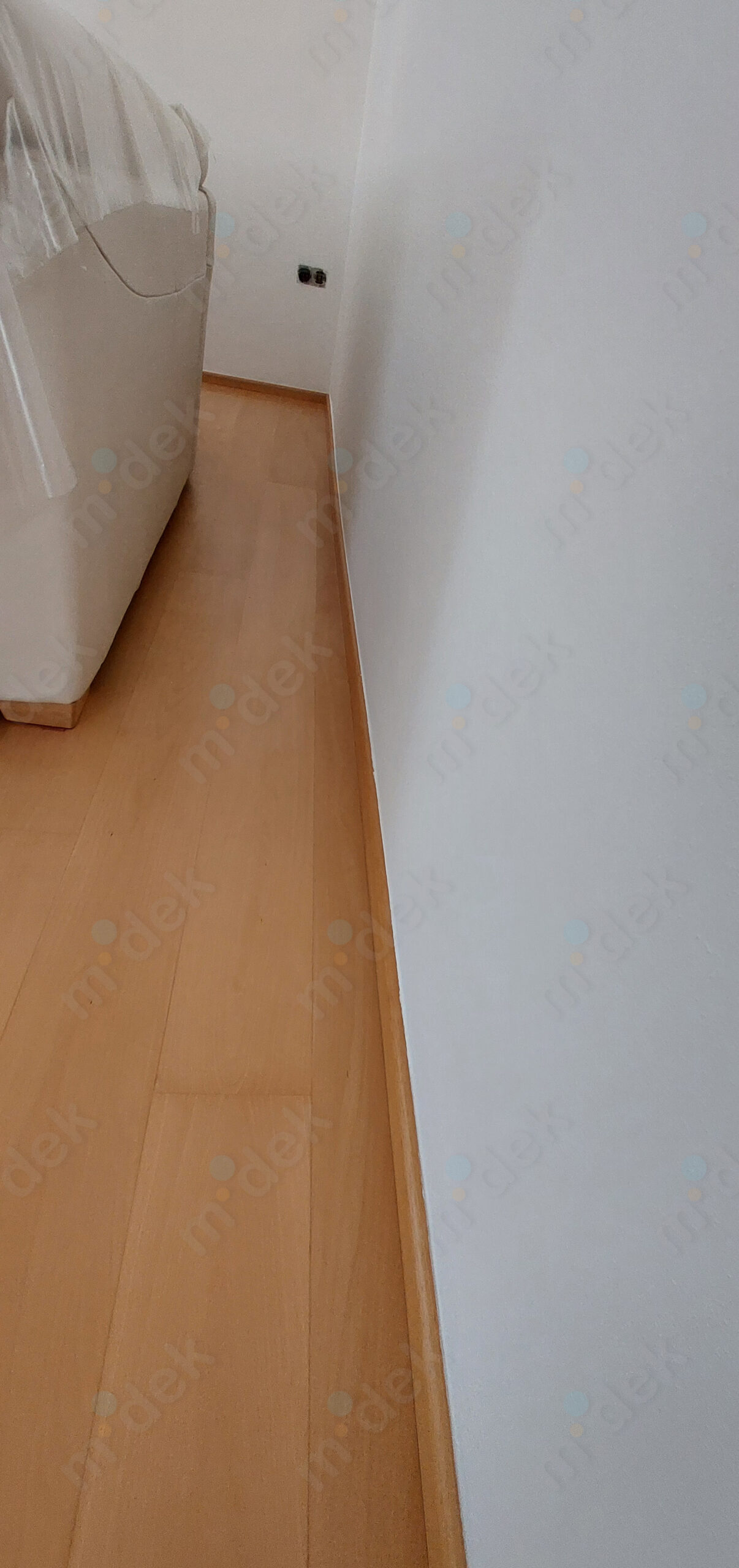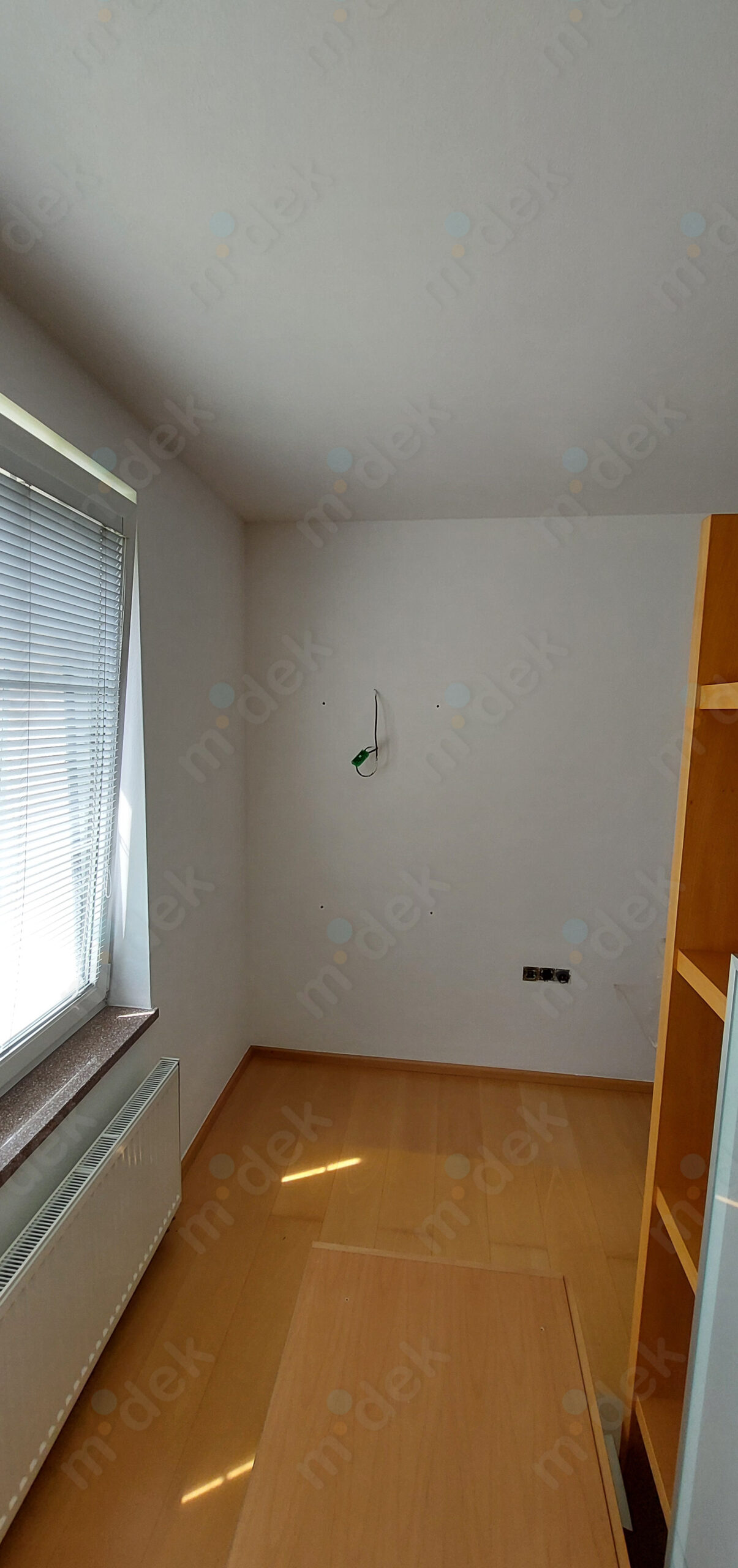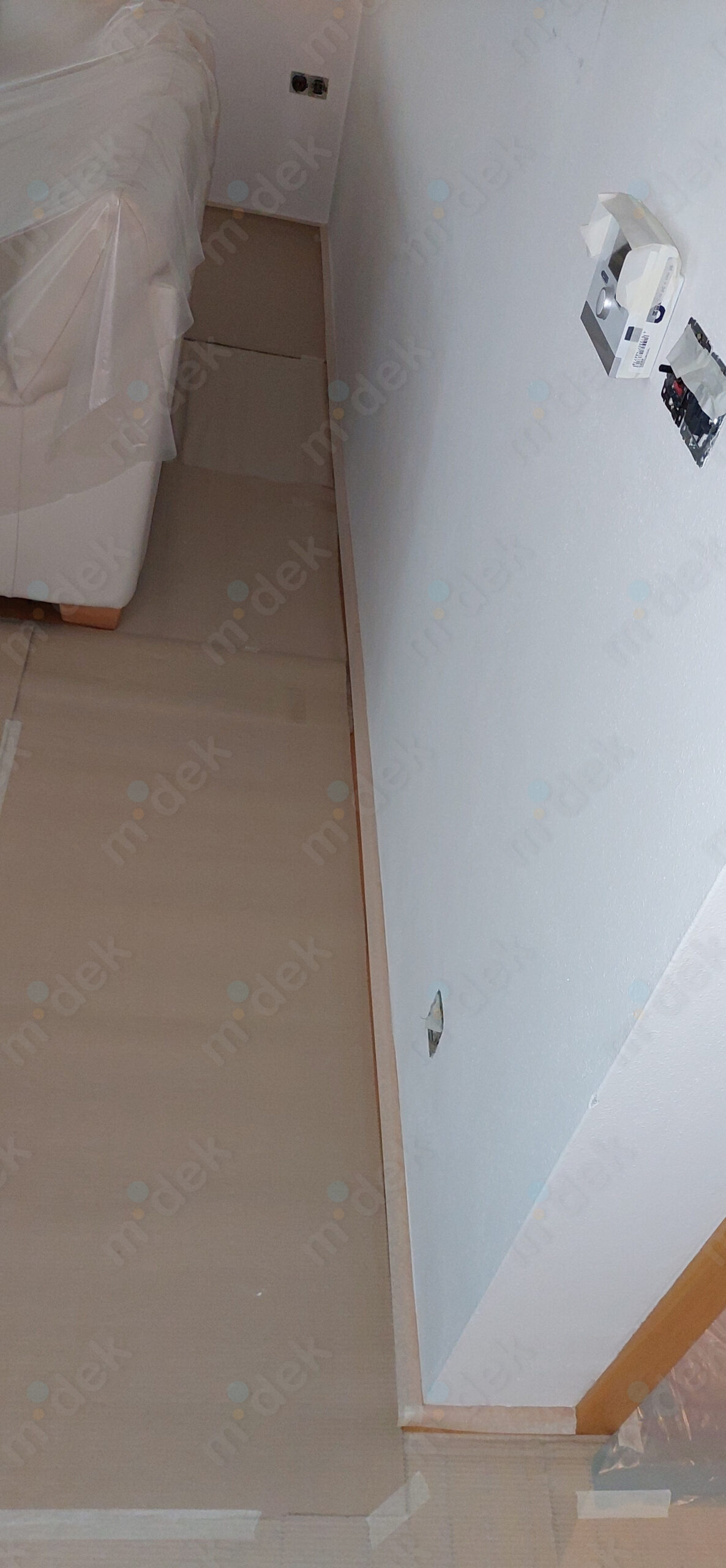 Zakrytí podlah, vyplnění rýh elektrorozvodů, nová omítka, penetrace, další lokální opravy omítek, částečné sundání linkrusty (sokl), 2 vrstvy akrylátové barvy, úklid.