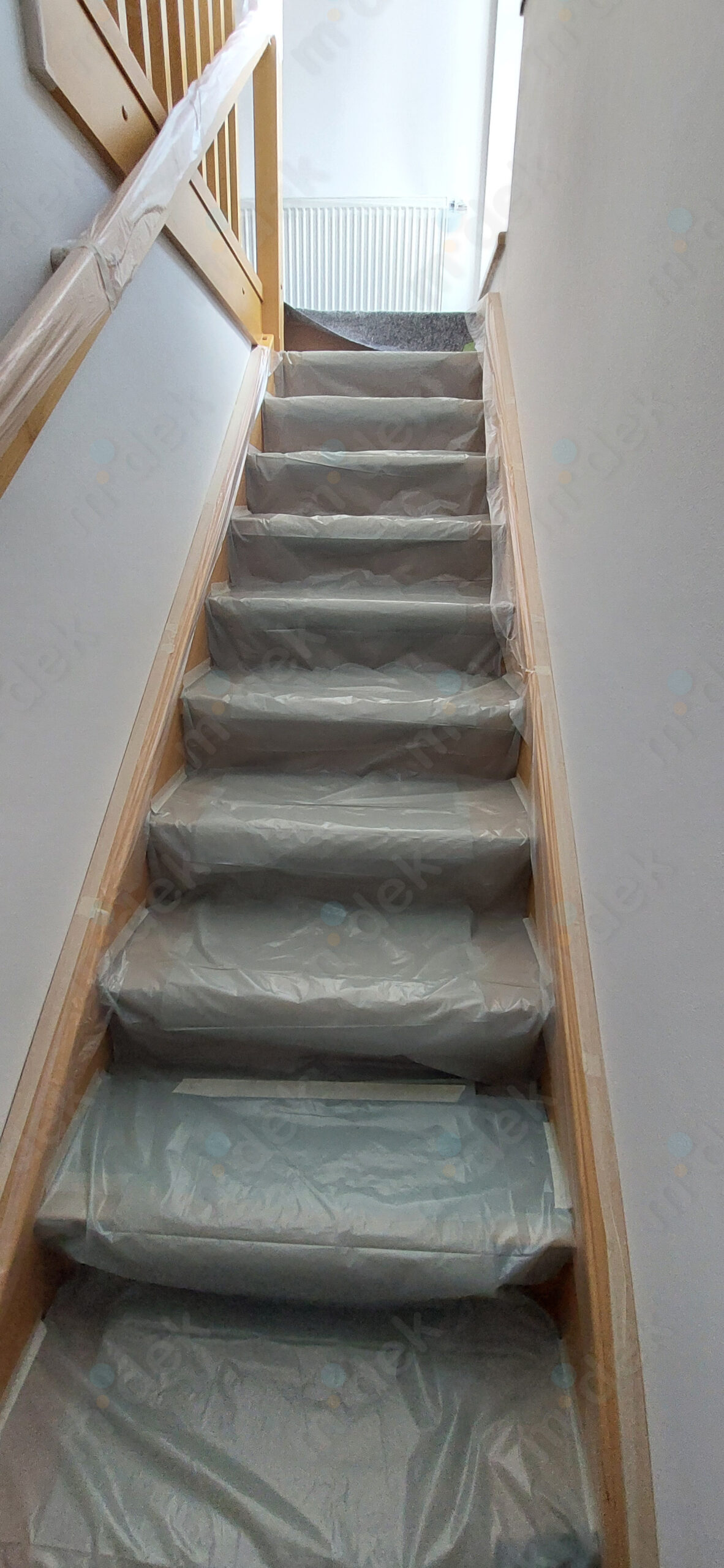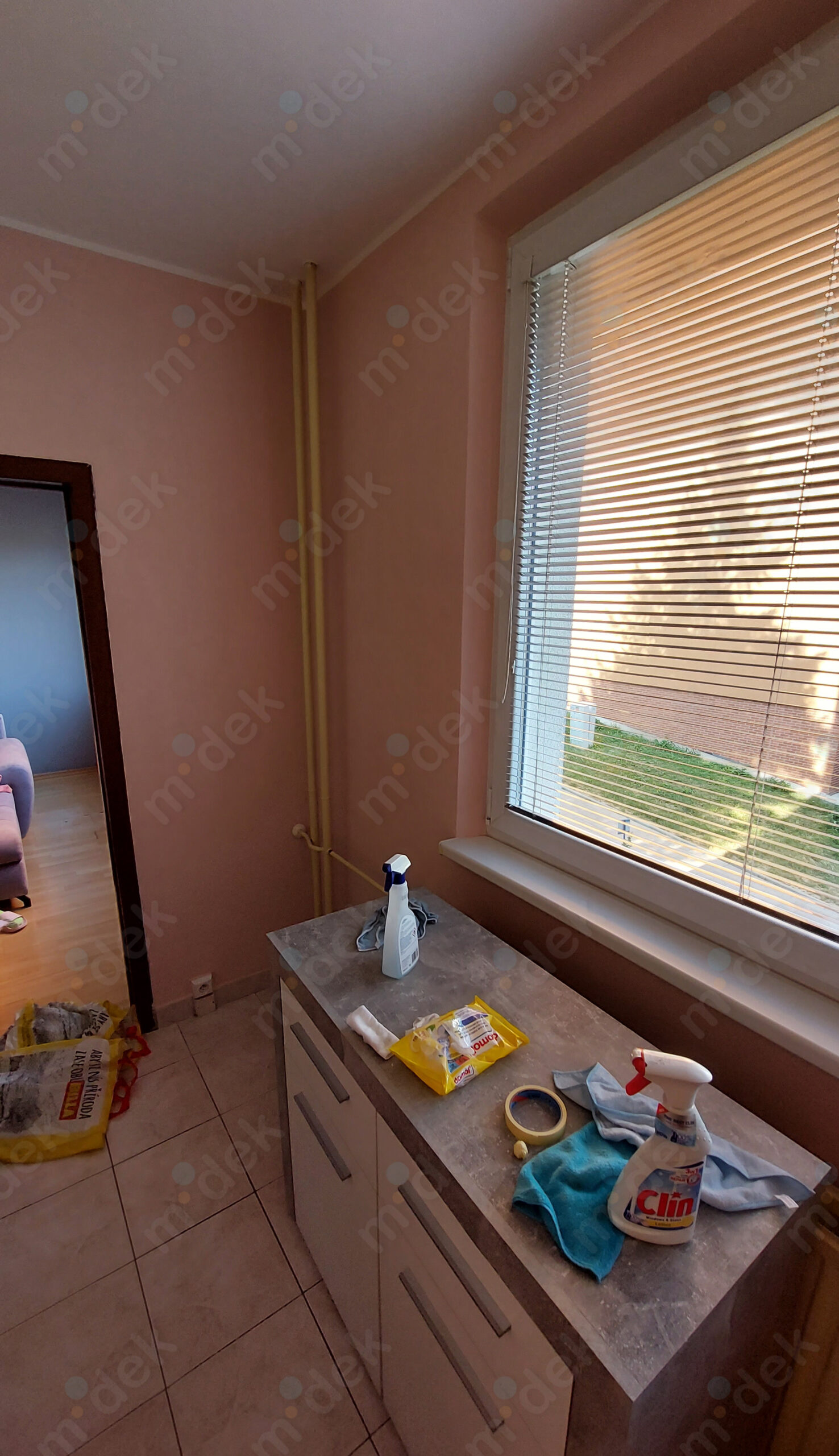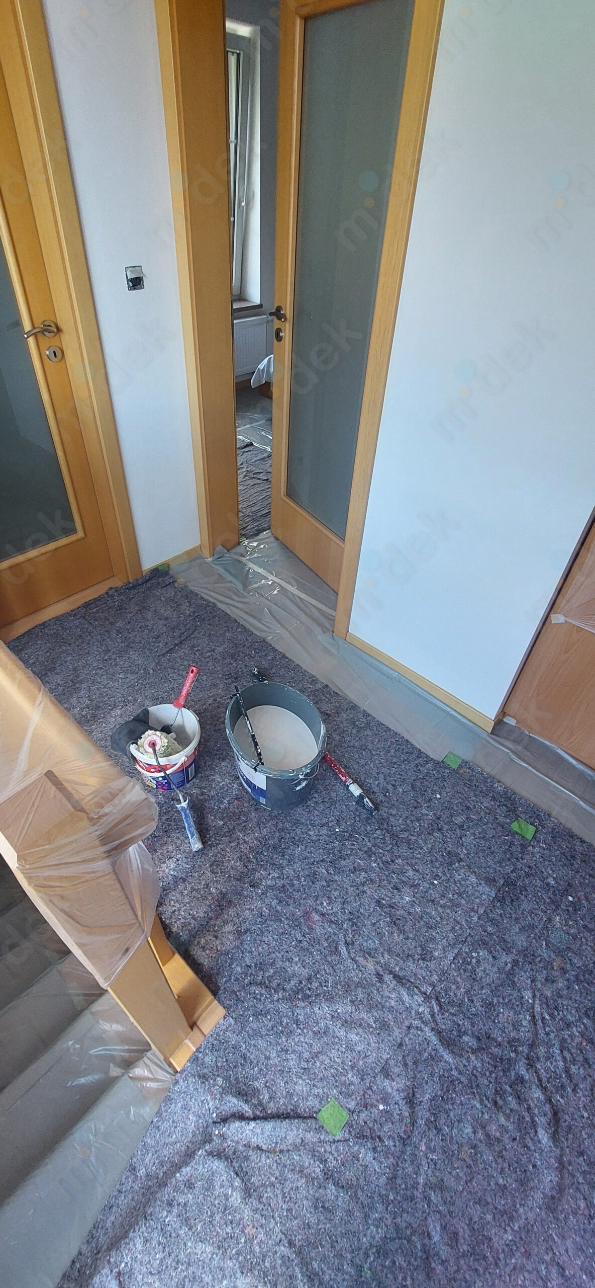 Zakrytí podlah, penetrace, lokální opravy omítek, spojů panelů, 2 vrstvy akrylátové barvy v odstínech bílé, šedé a starorůžové, úklid.