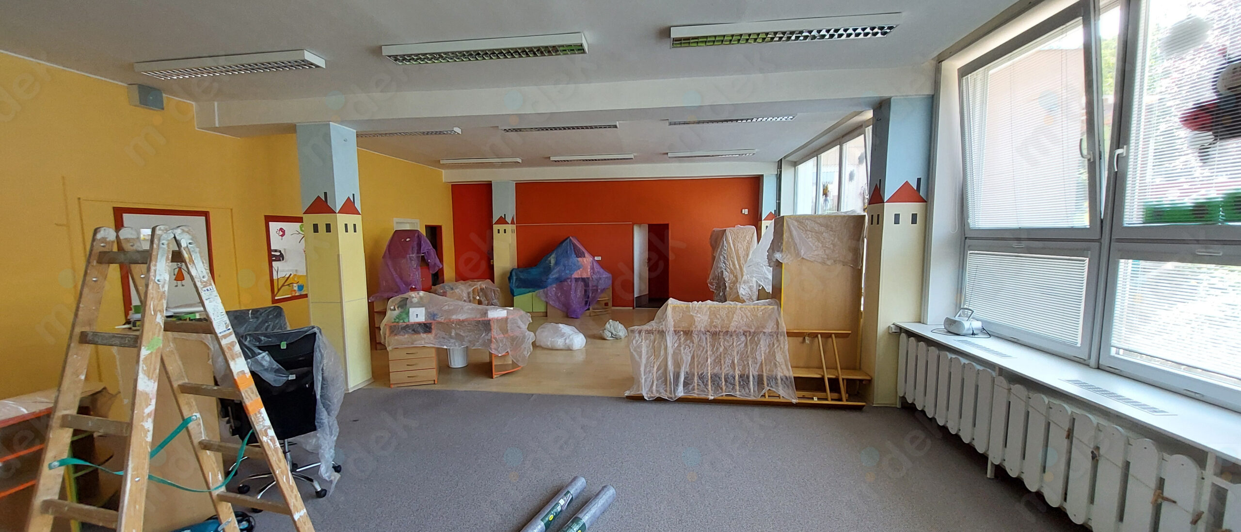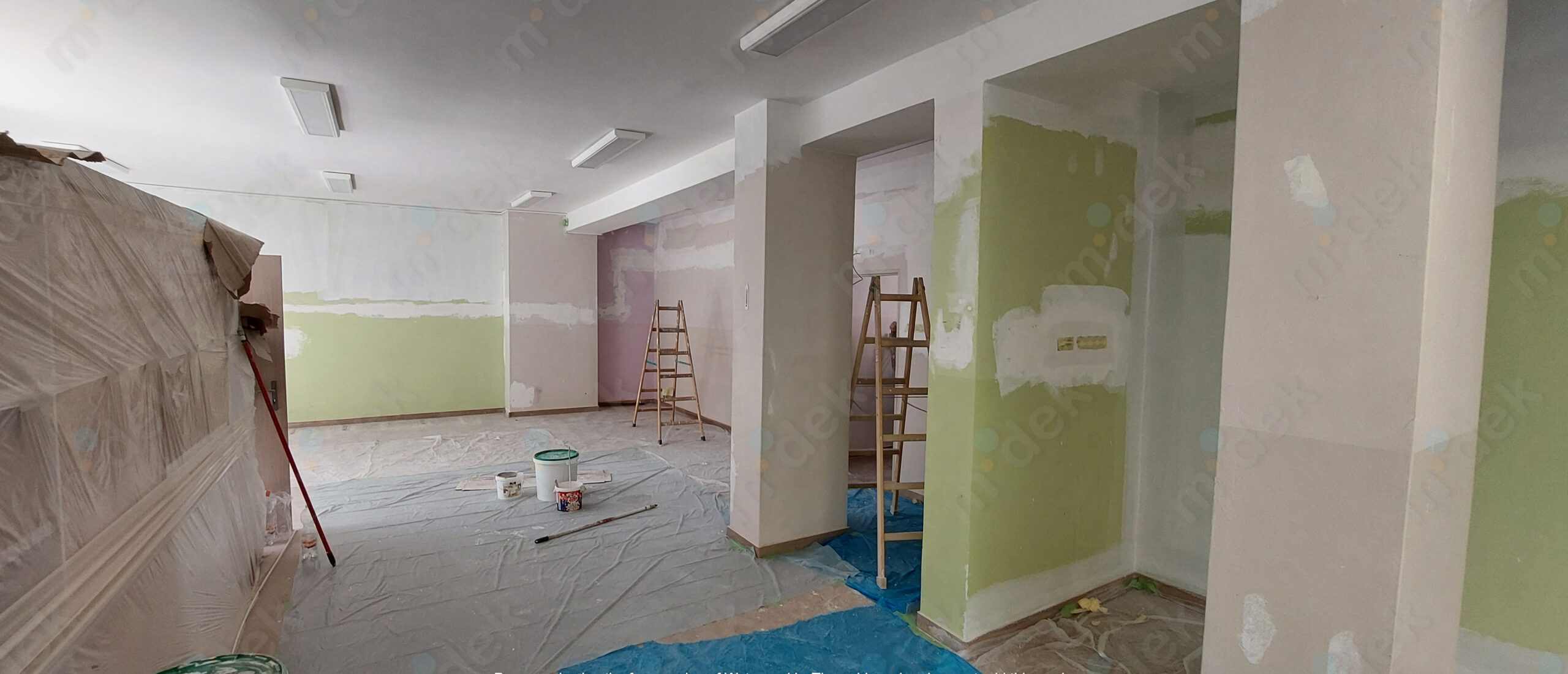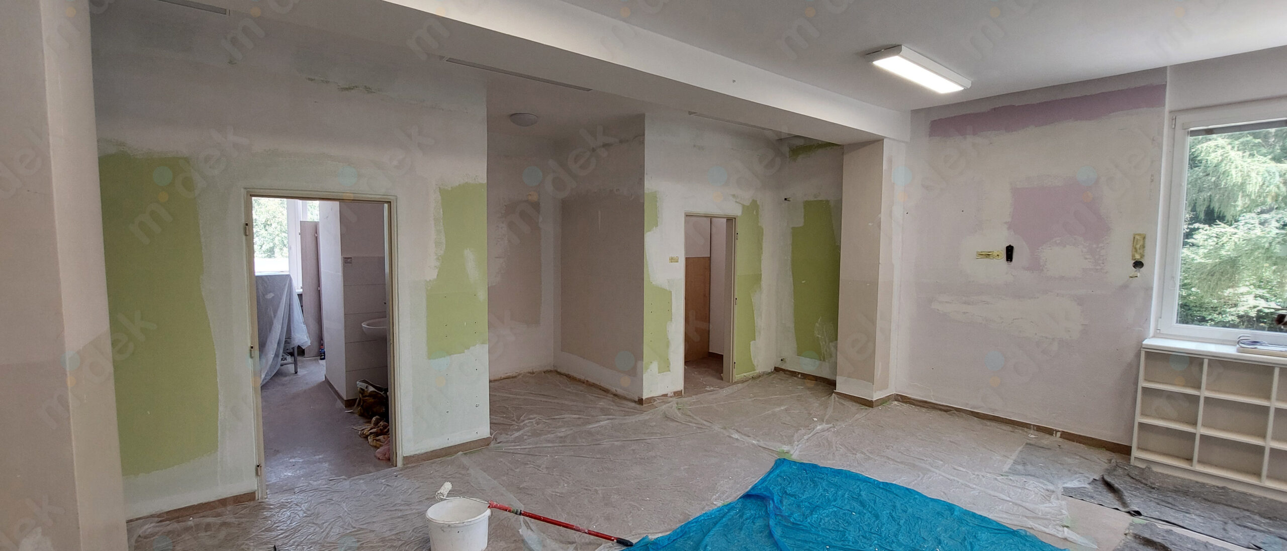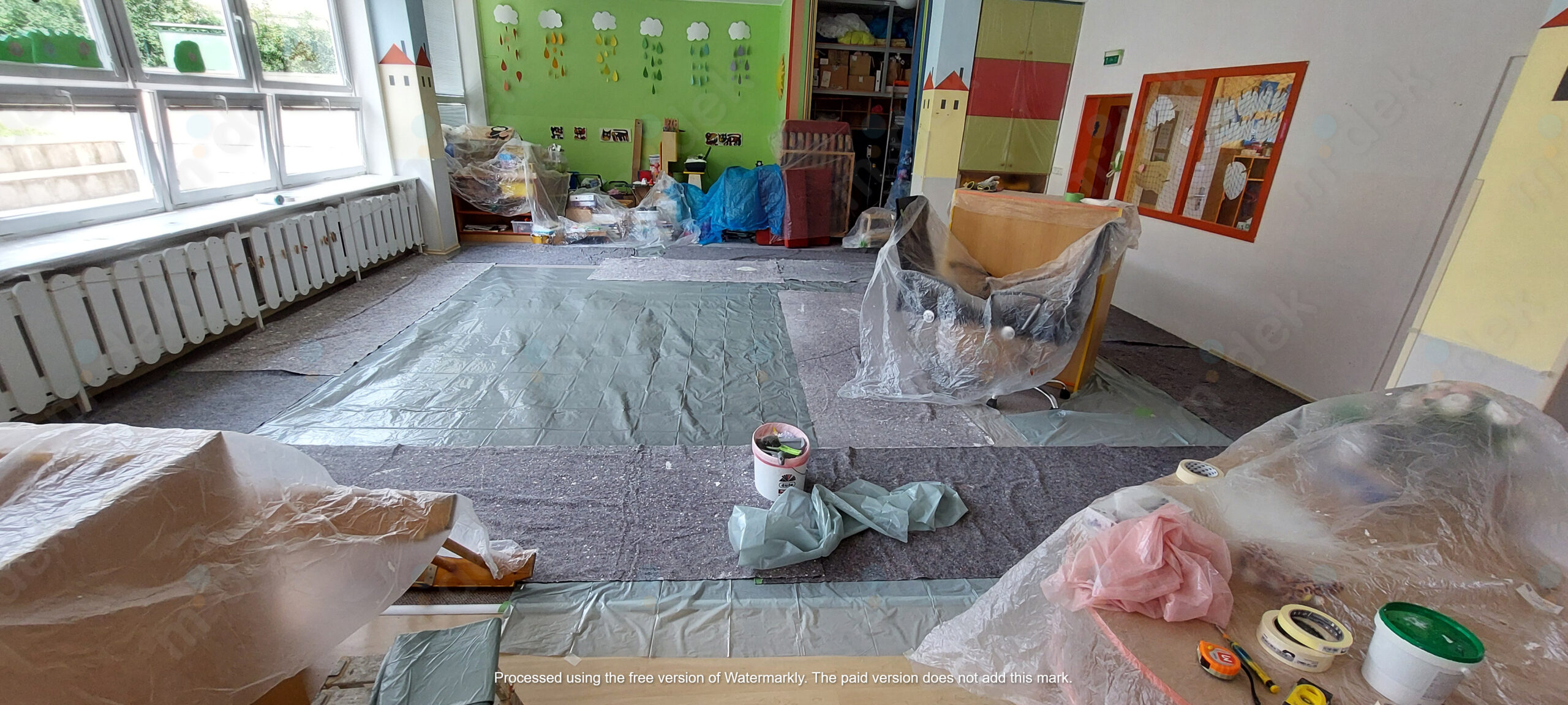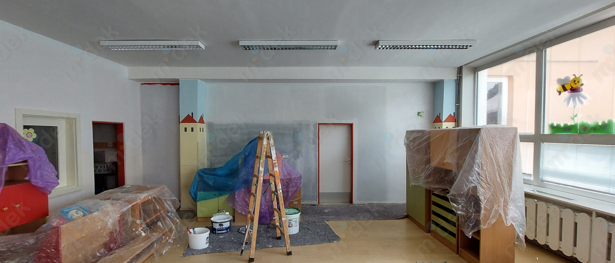 Zakrytí podlah, penetrace, lokální opravy omítek, obnovení magnetické barvy na jedné stěně, 2 vrstvy akrylátové barvy, úklid.