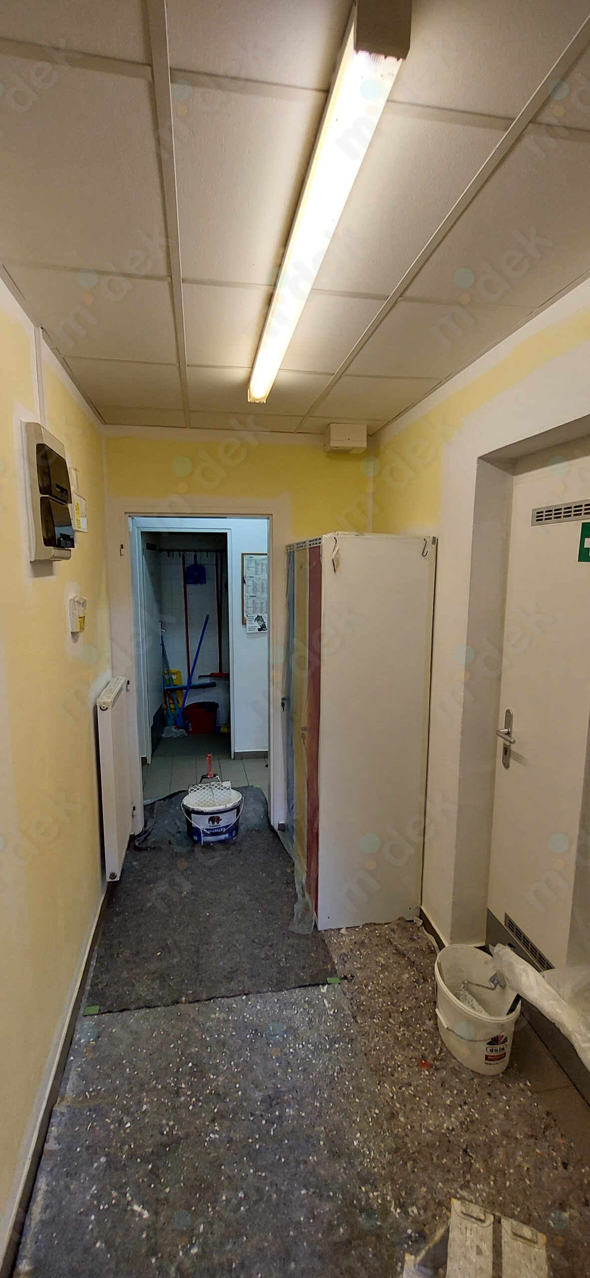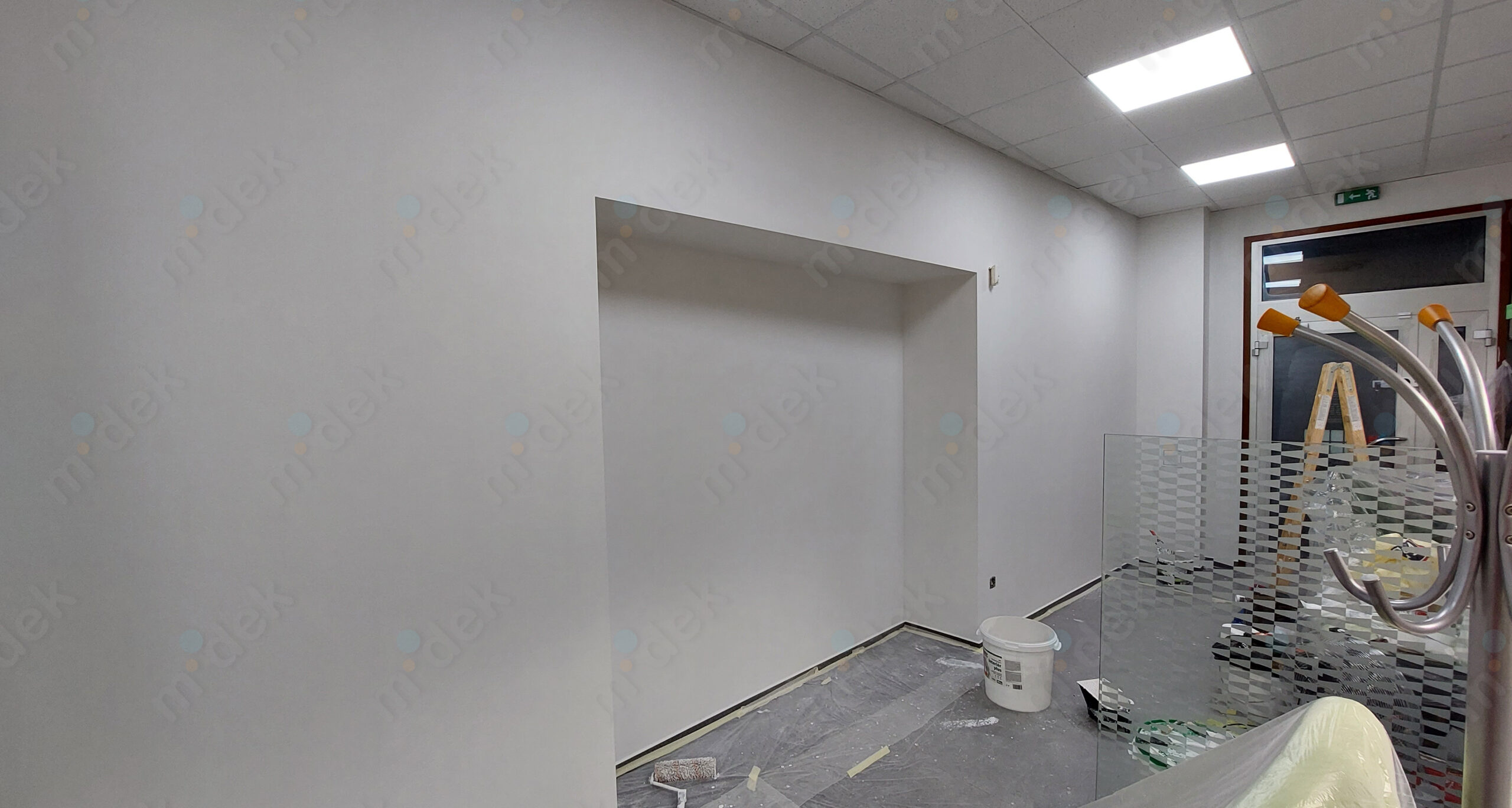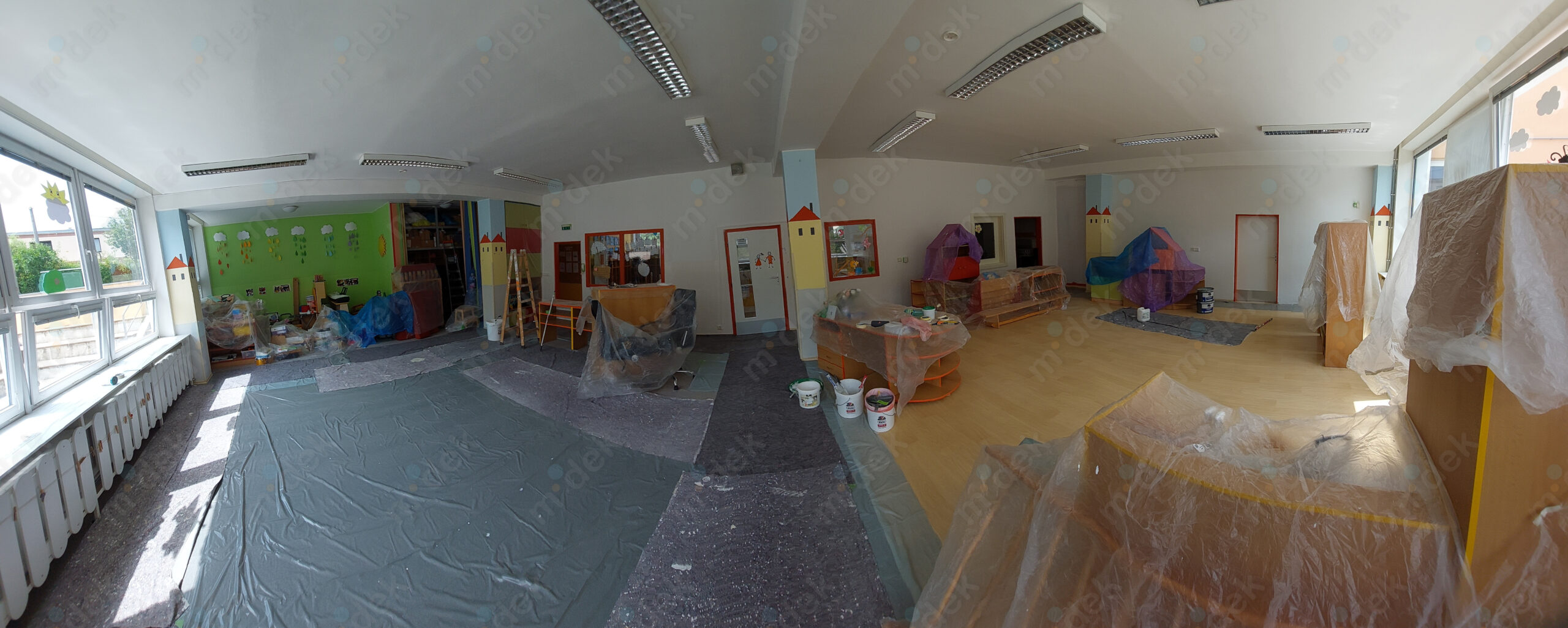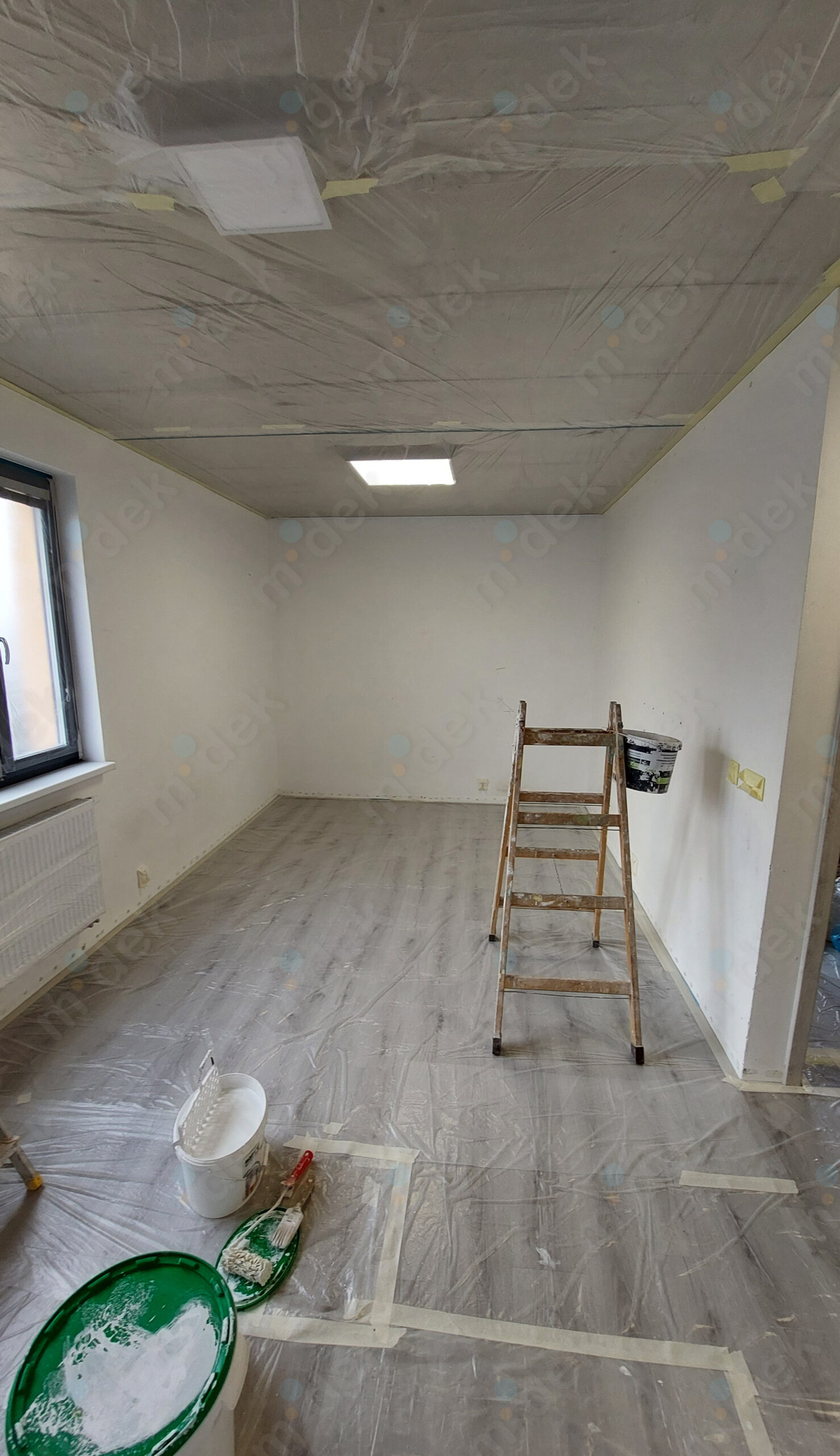 Zakrytí podlah, penetrace, lokální opravy omítek, obnovení magnetické barvy na jedné stěně, 2 vrstvy akrylátové barvy, úklid.