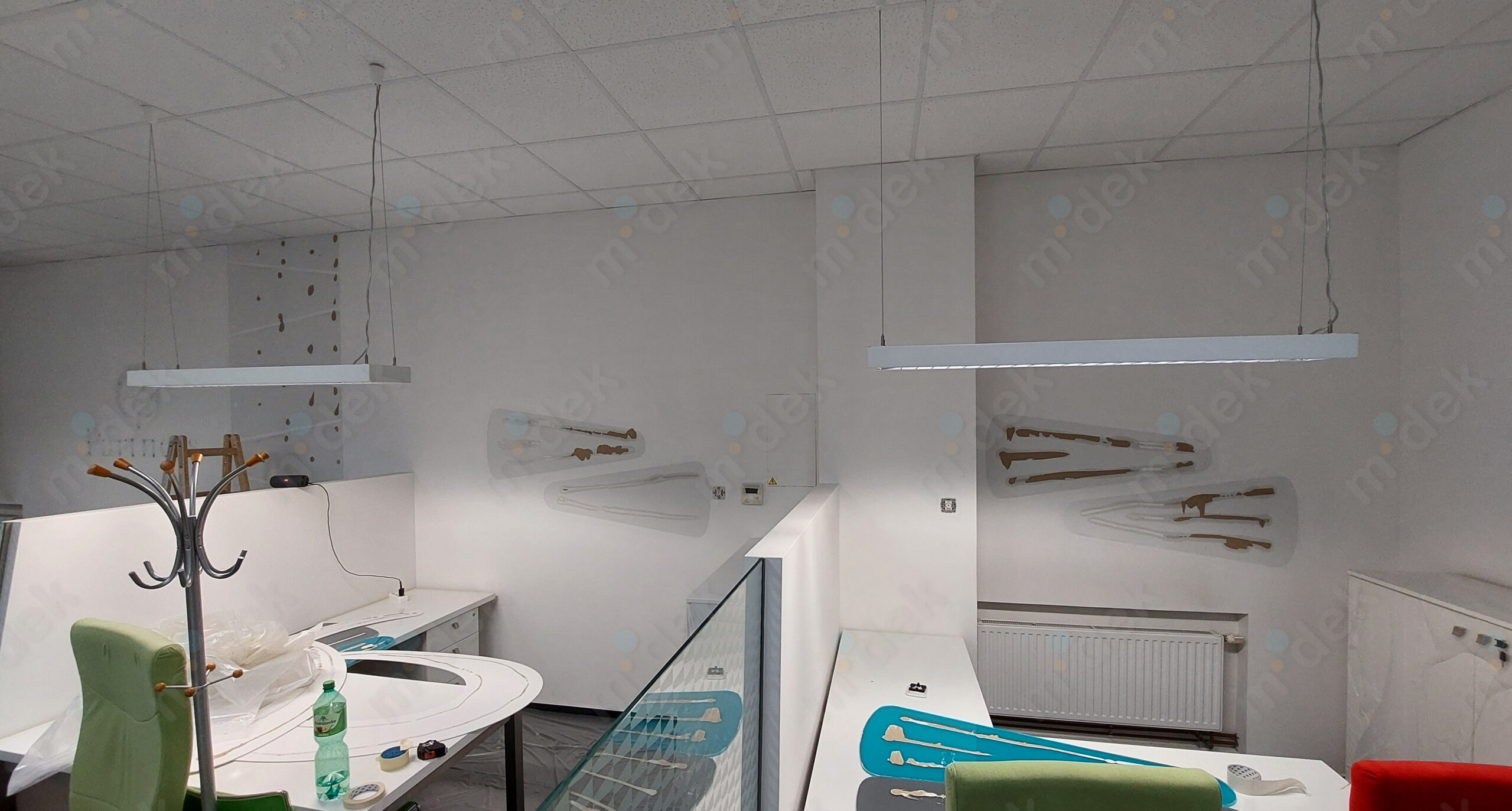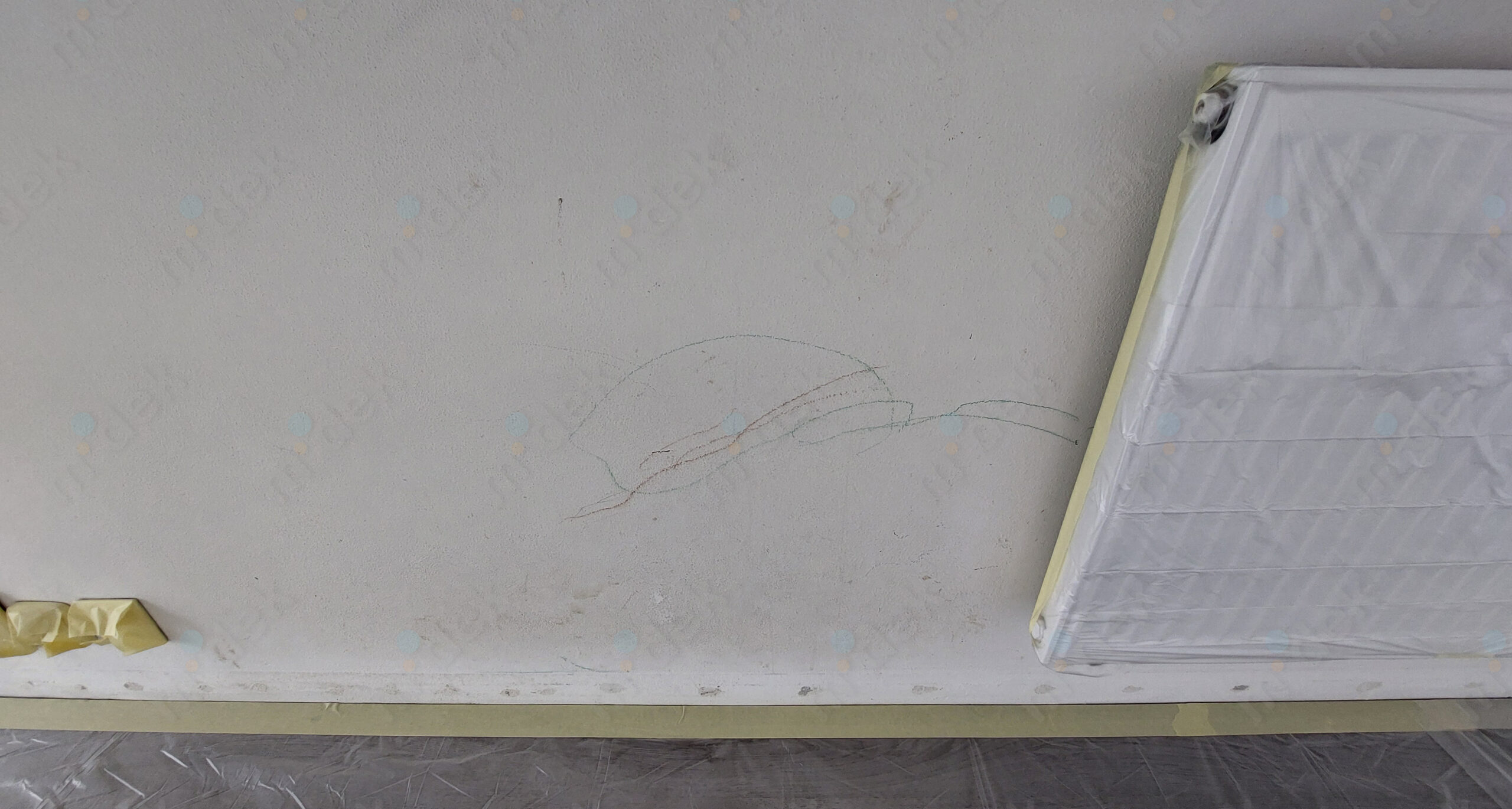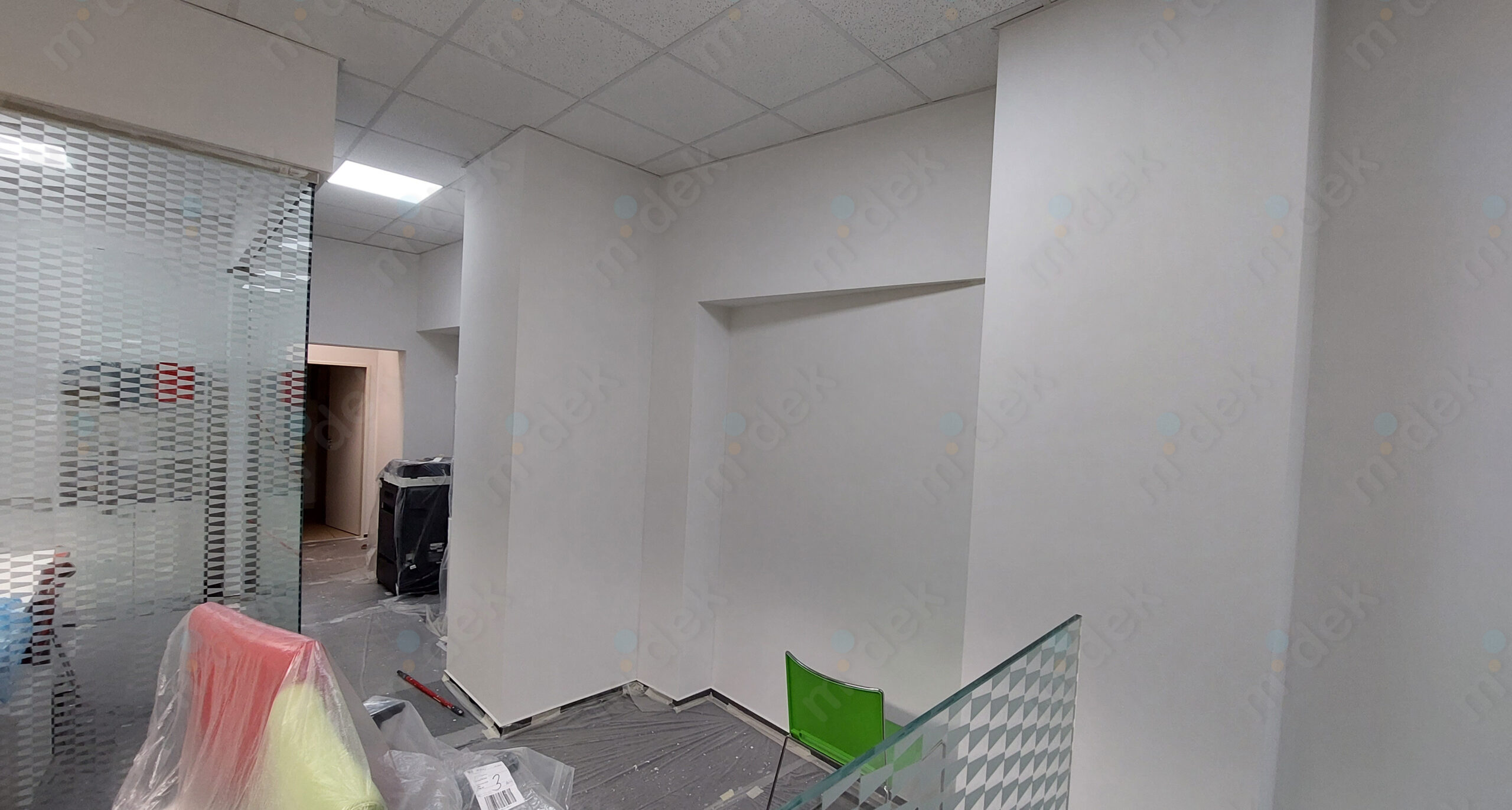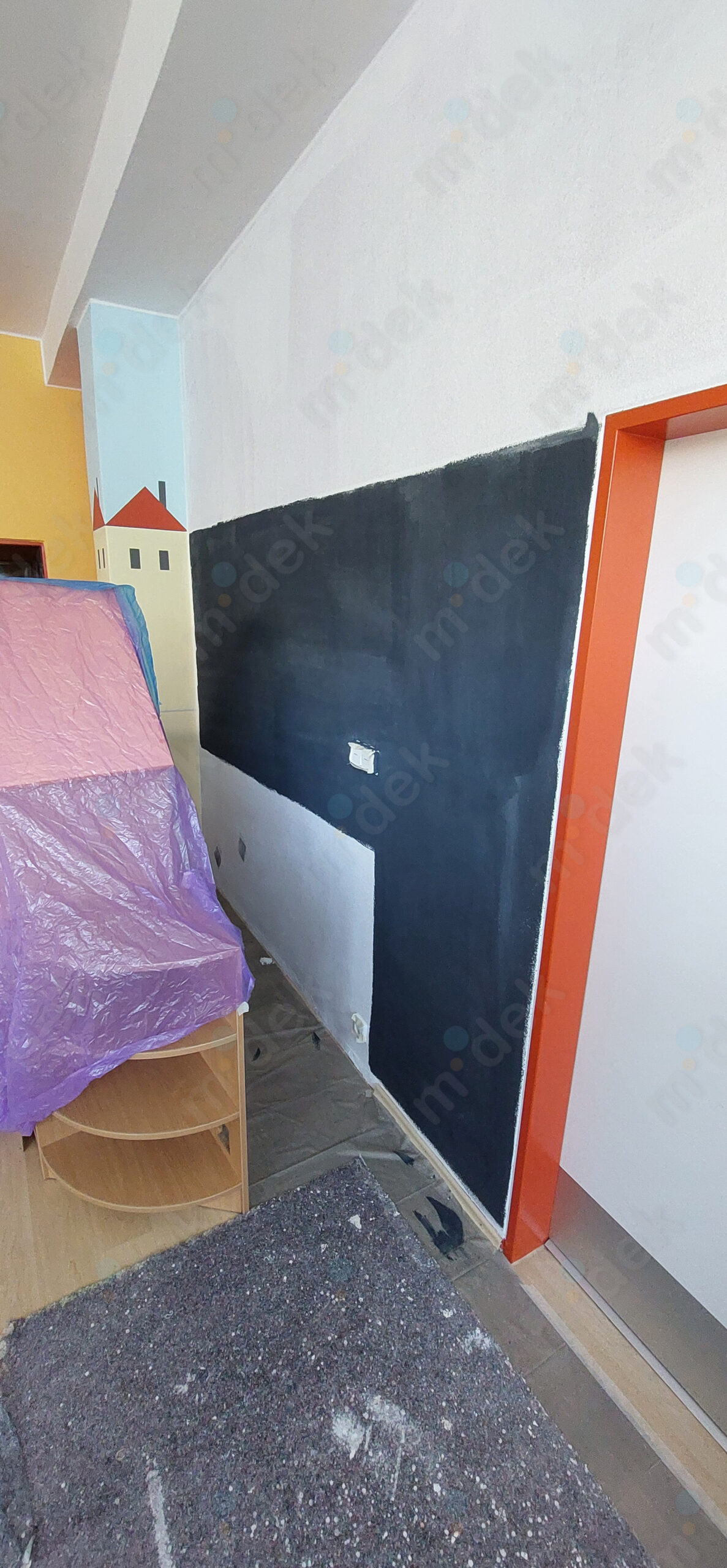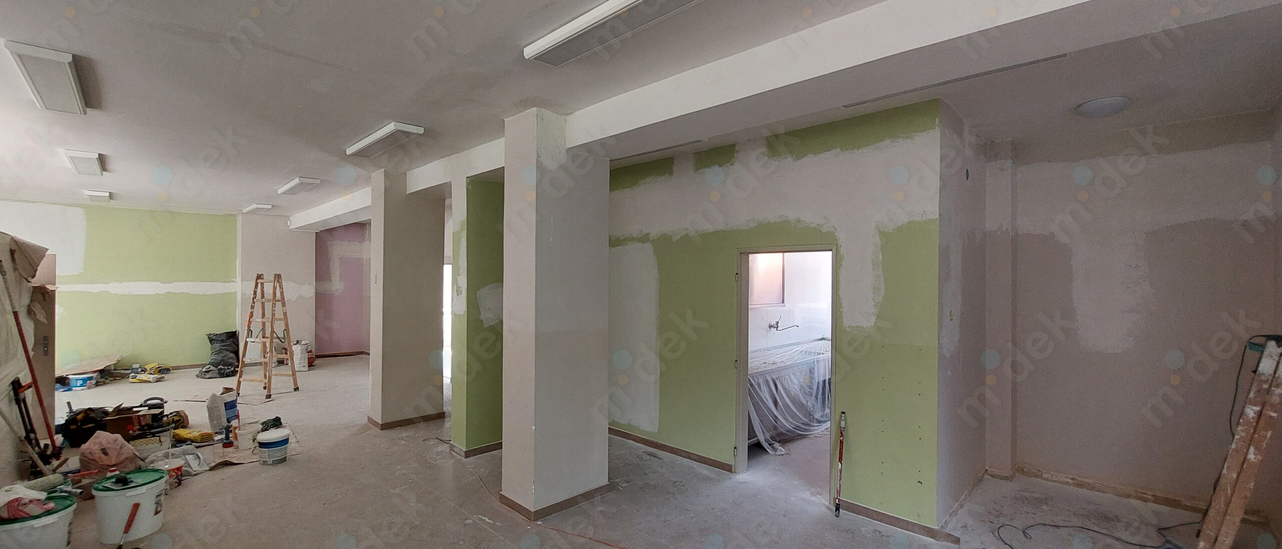 Zakrytí podlah, penetrace, lokální opravy omítek, obnovení magnetické barvy na jedné stěně, 2 vrstvy akrylátové barvy, úklid.