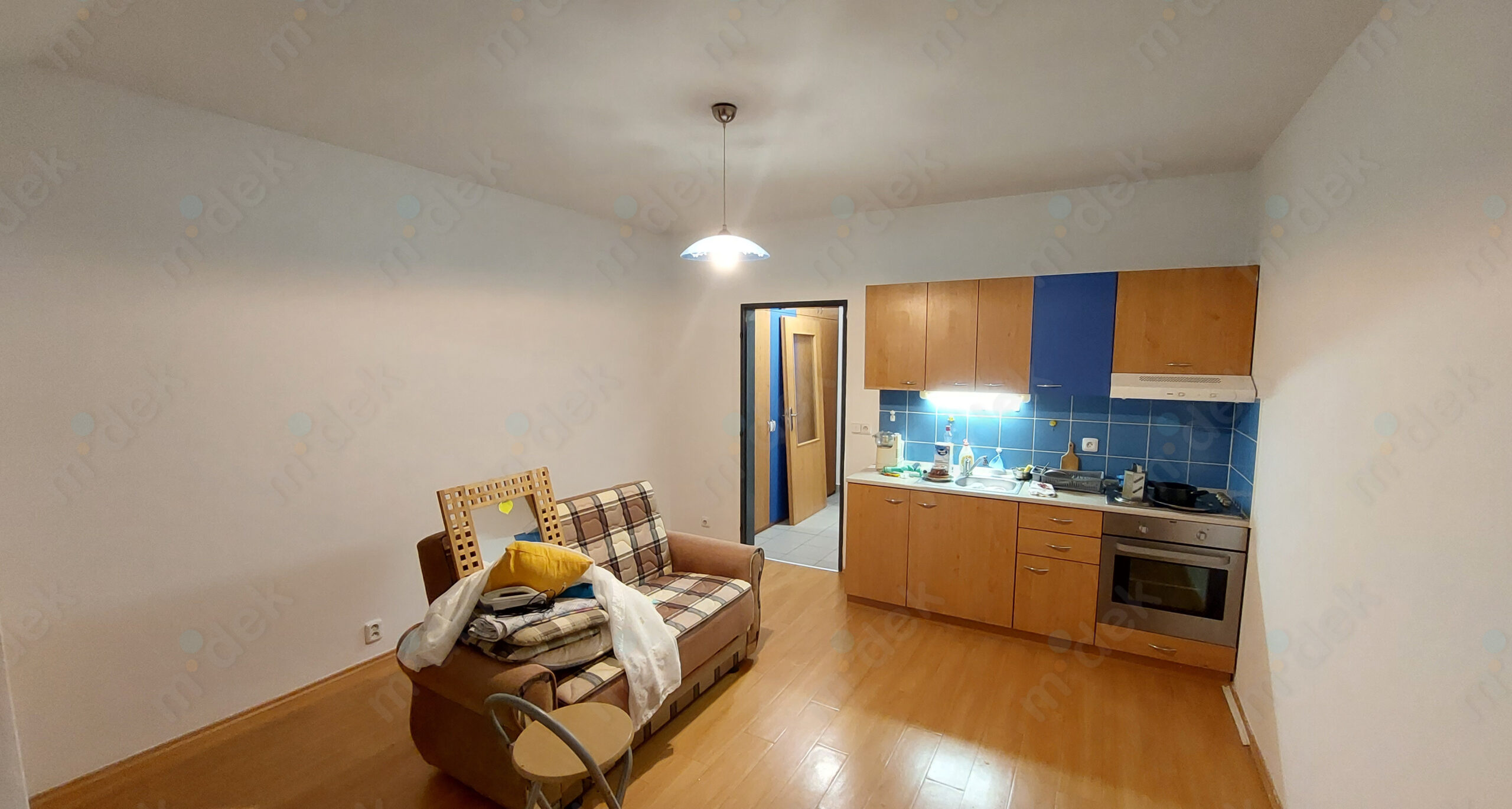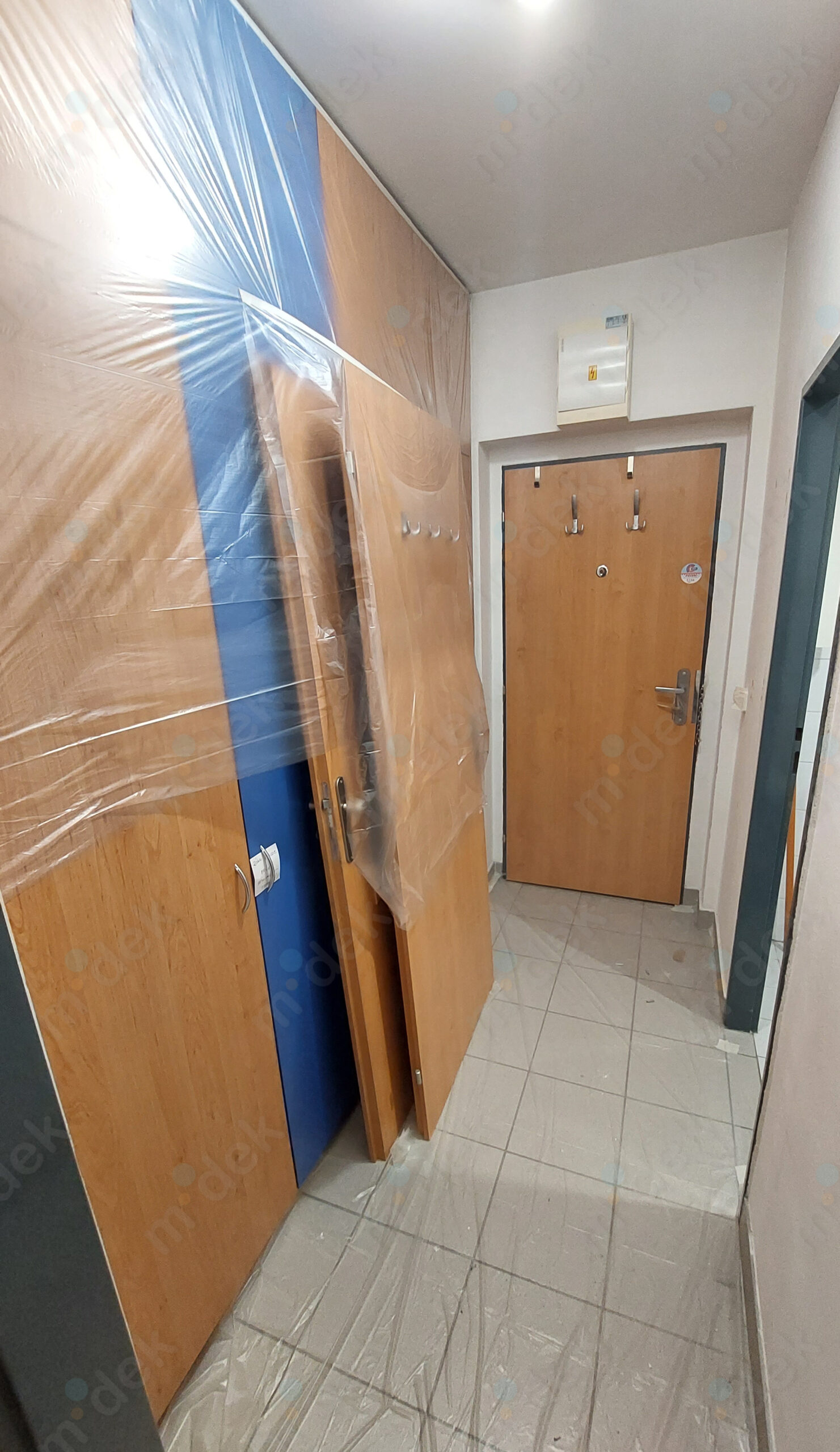 Zakrytí podlah, odstranění dekorací ze zdí, penetrace, lokální opravy omítek, opravy spojů SDK, 2 vrstvy akrylátové barvy, úklid.