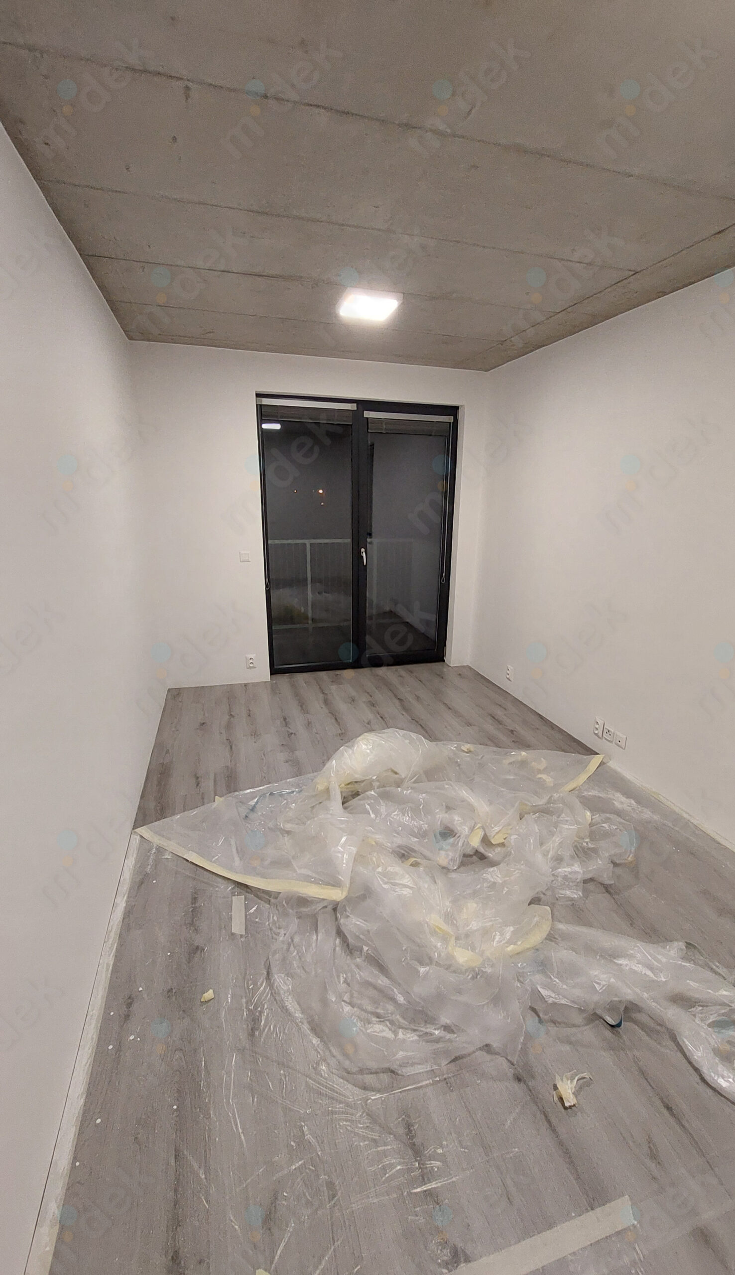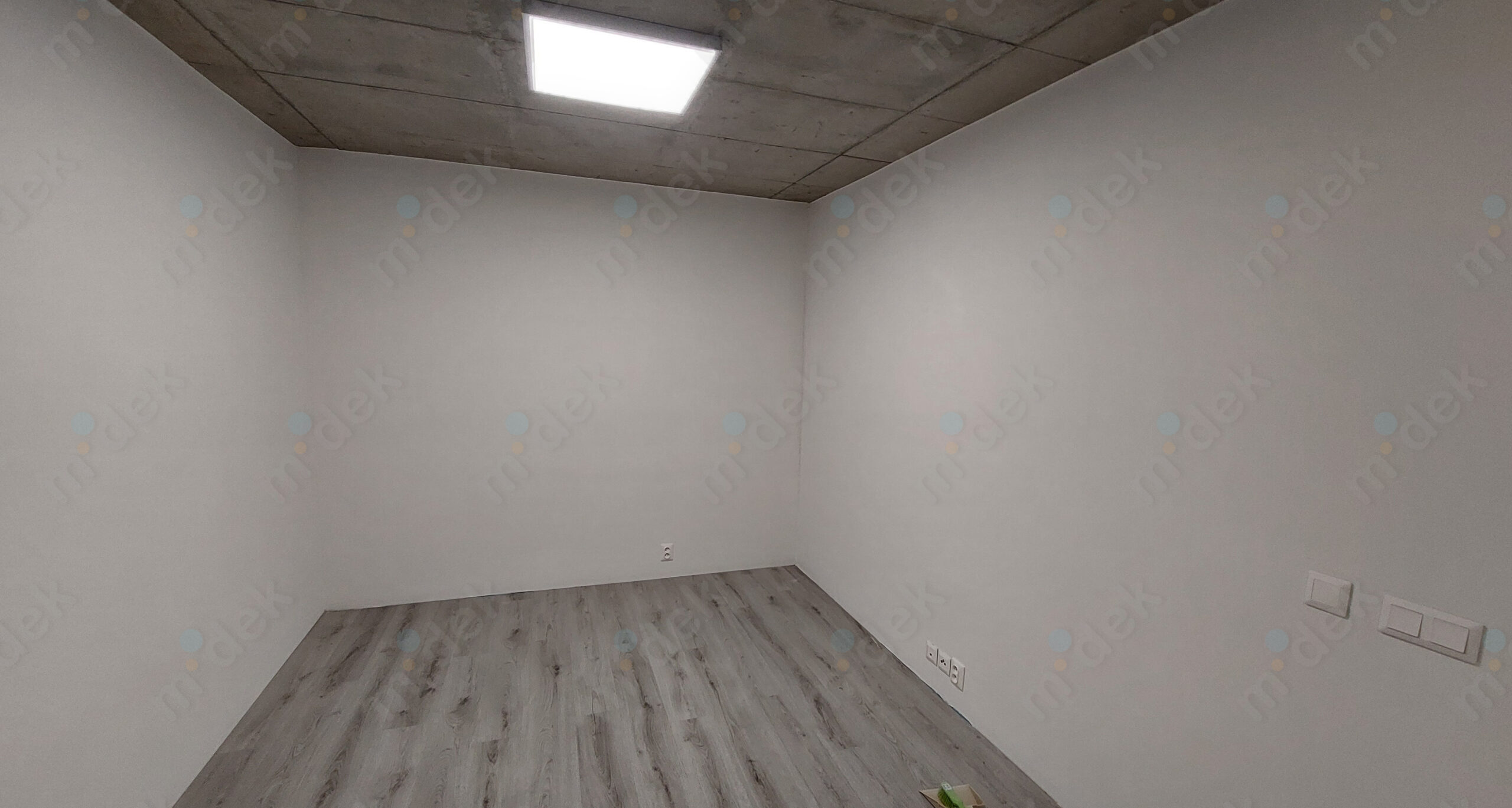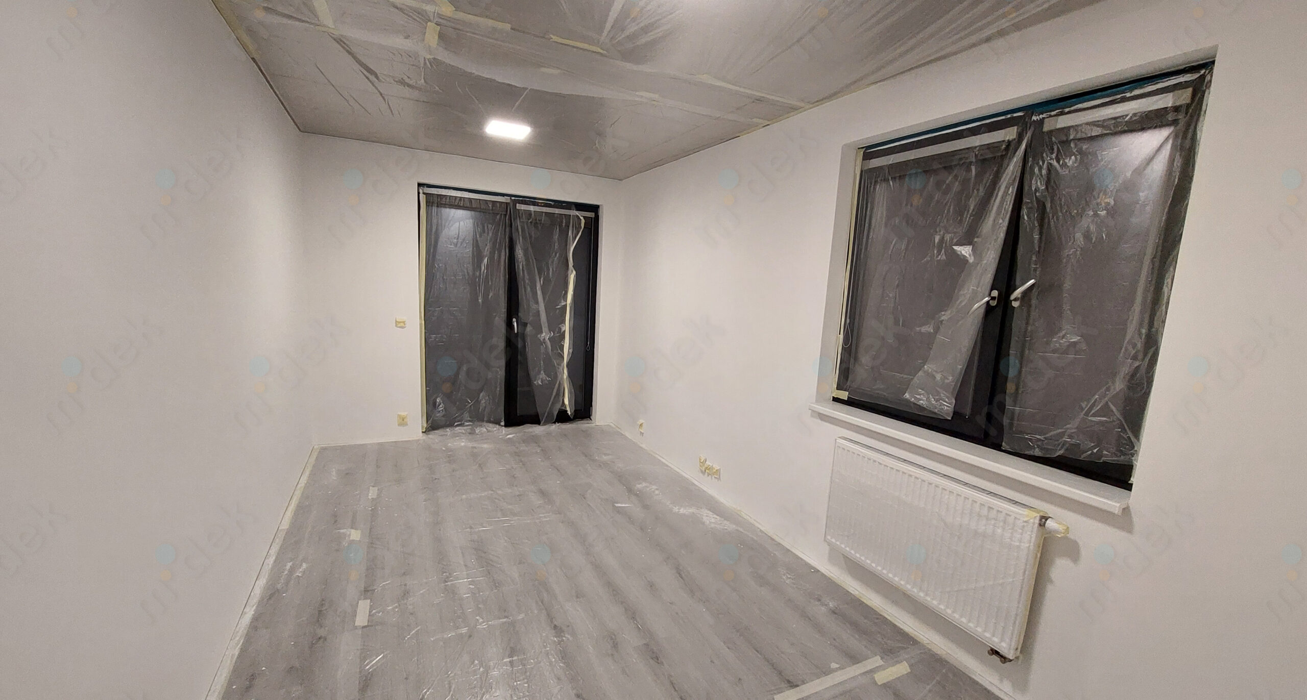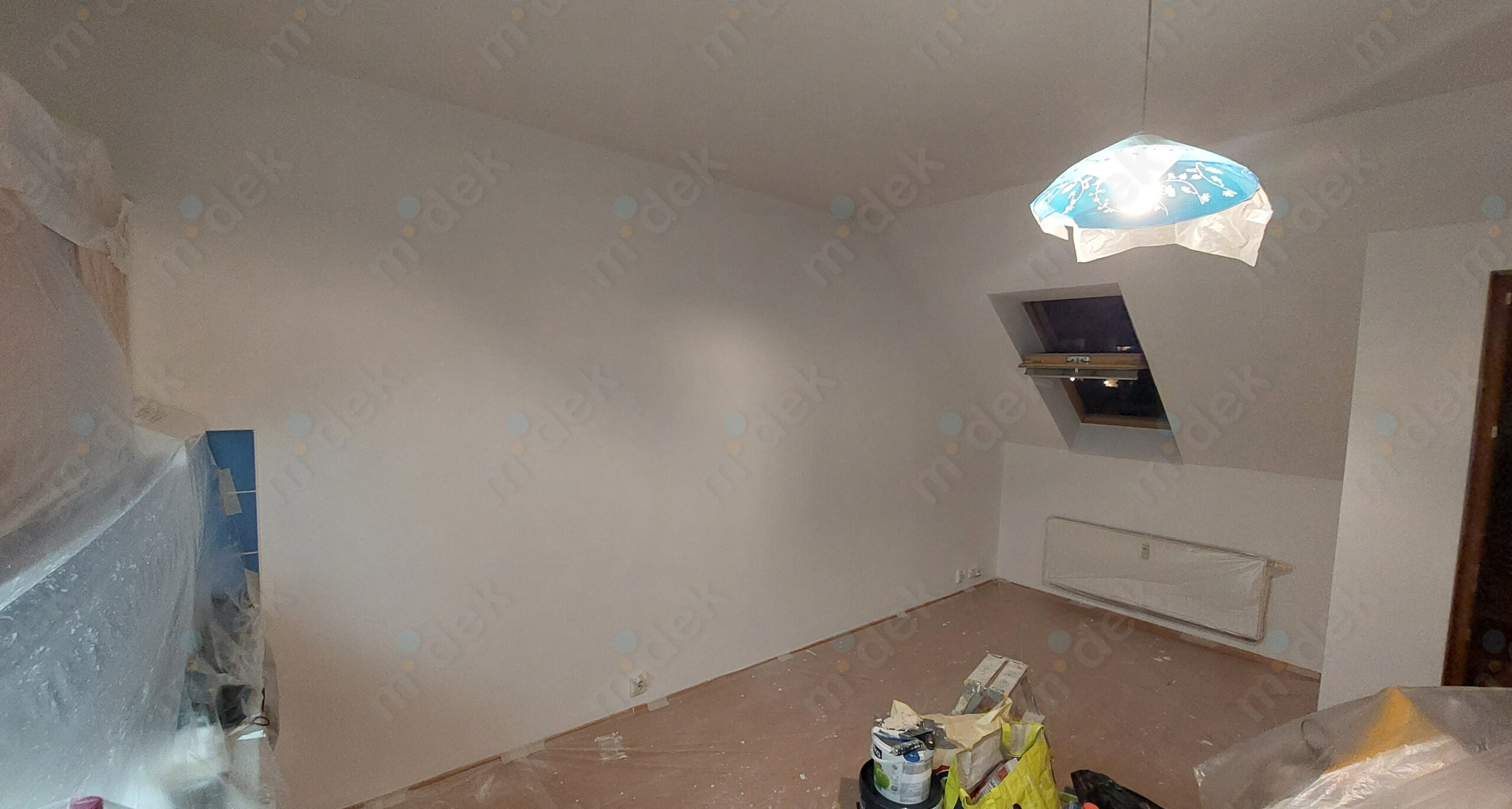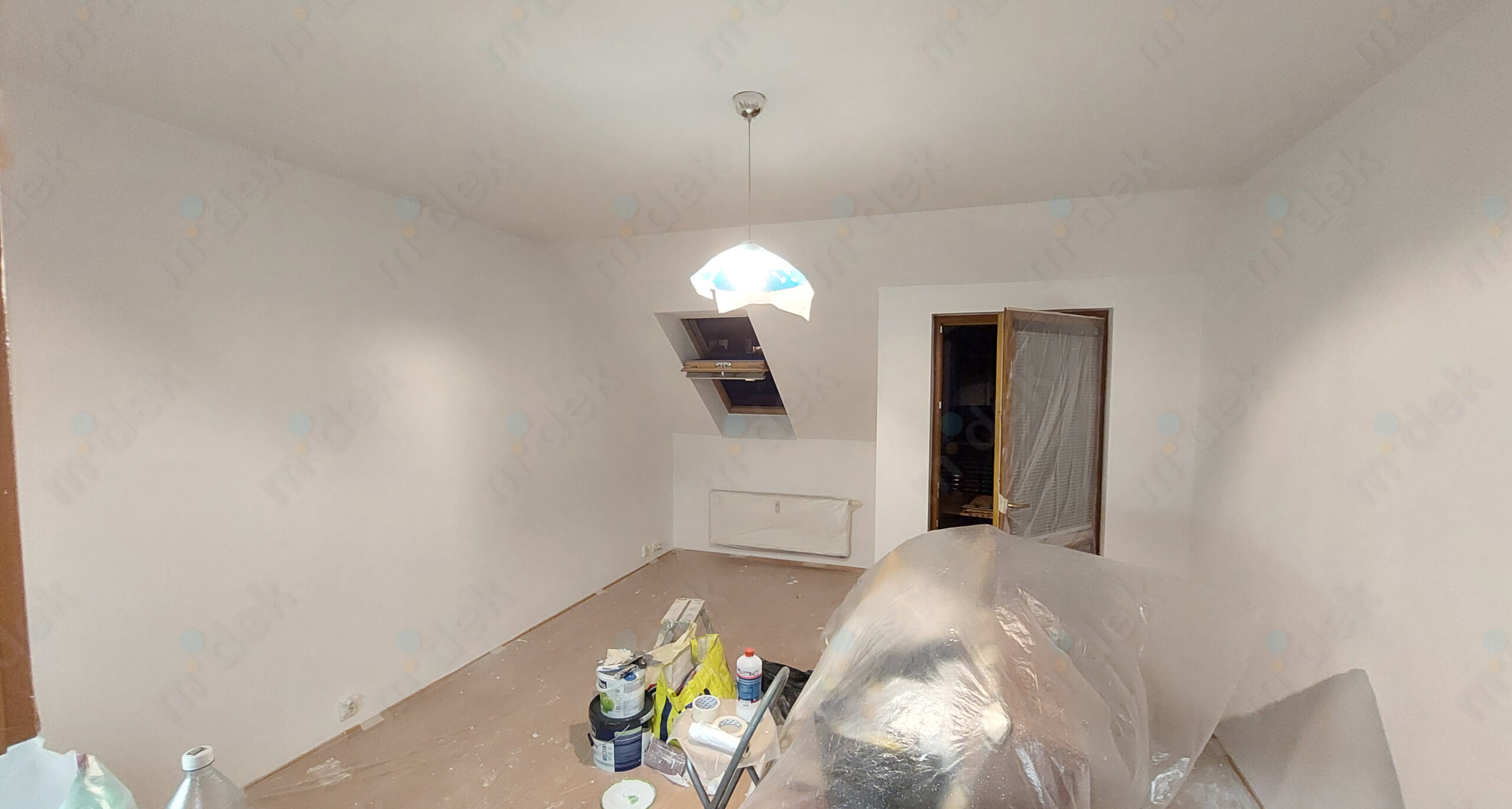 Zakrytí podlah, penetrace, lokální opravy omítek, opravy SDK rohů kolem stropu, 2 vrstvy akrylátové barvy, úklid.
