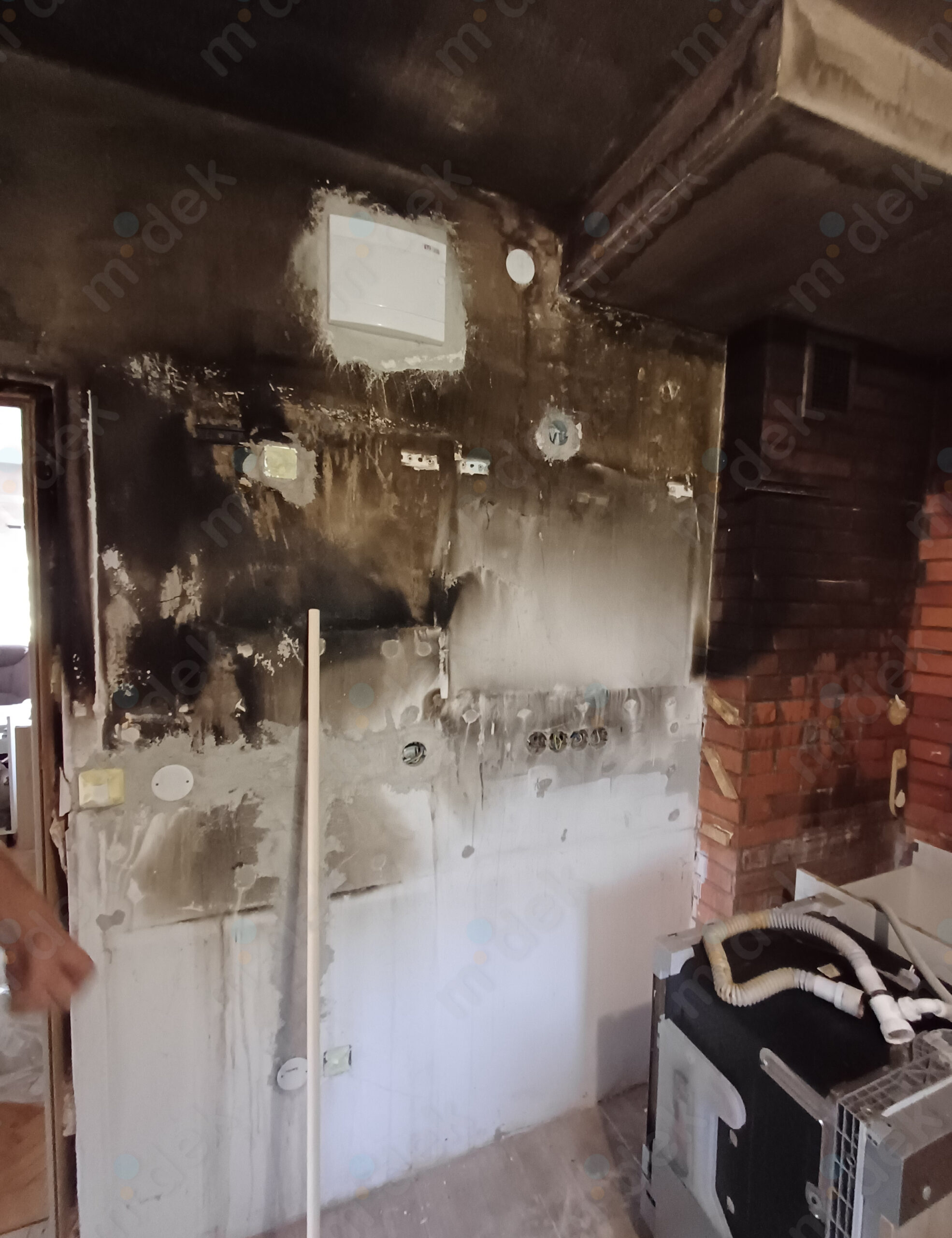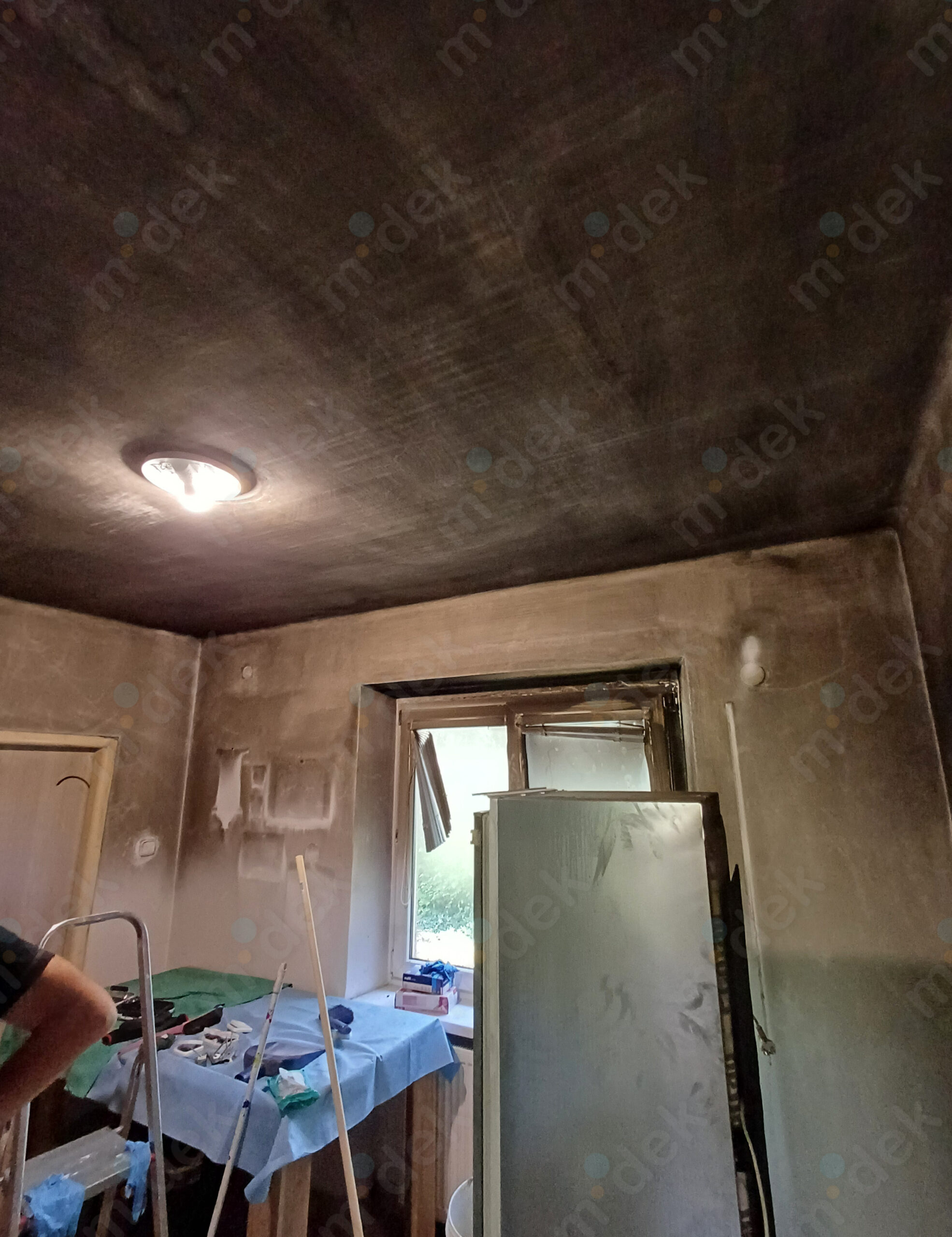 Mechanické odstranění sazí ze zdí a stropů, několikanásobná penetrace, opravy omítek, speciální izolační nátěr, 3 vrstvy vysoce kvalitní akrylátové barvy, úklid.